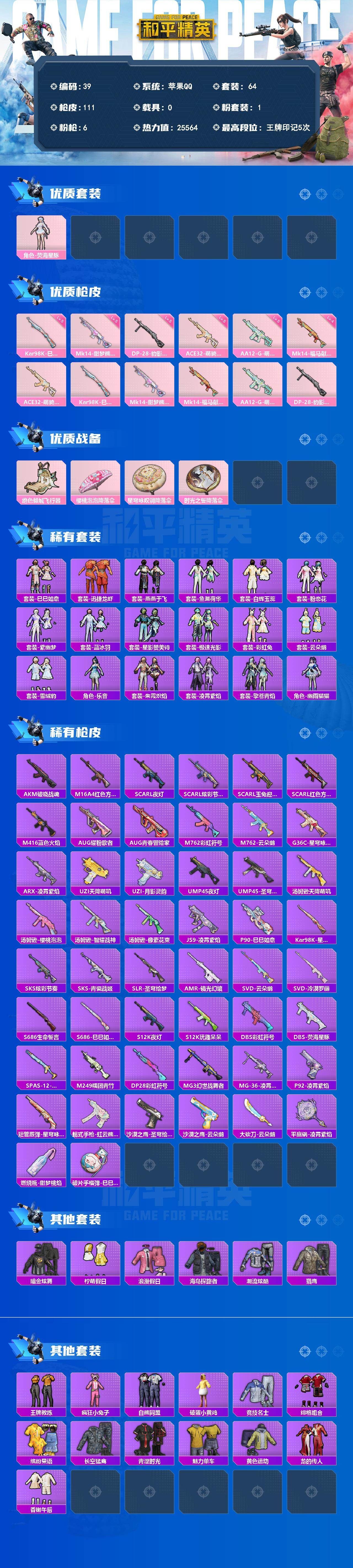 XS11524【地铁满天赋1粉装-6特效枪】苹果手Q-1粉装-6特效枪-64套装-111枪皮-5王牌印记-不朽星钻Ⅴ-25564热力值【1粉装】角色-荧海星豚【6特效枪】Mk14-甜梦熊击[5级],ACE32-萌骑漫游[5级],DP-28-豹影疾电[5级],Mk14-福马献瑞[4级],AA12-G-萌骑幻想[5级],Kar98K-巳巳如意[5级]【3飞行器】绝色倾城飞行器,破刃行动尾迹,异域银装