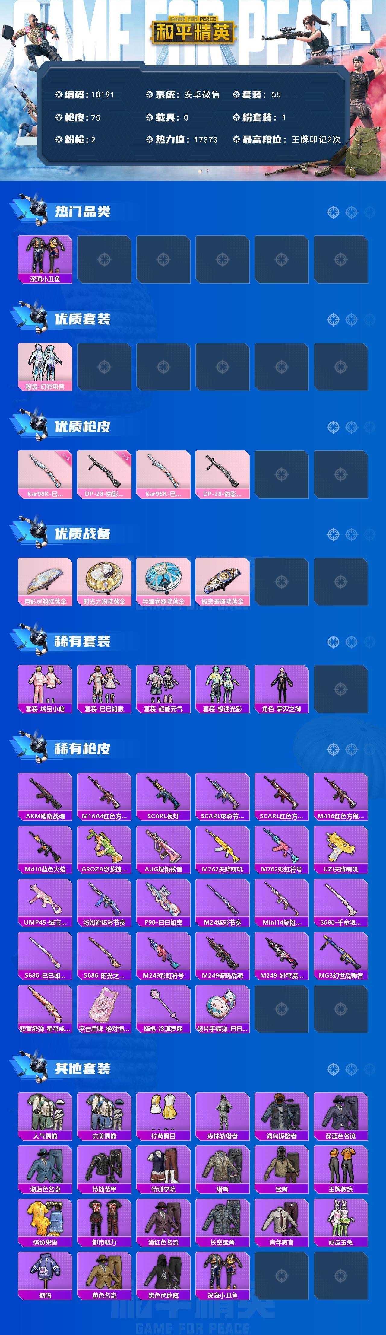 安卓 微信-1粉装-2特效枪-0载具-1粉色飞行器-17373热力值-2王牌印记-55套装-75枪皮