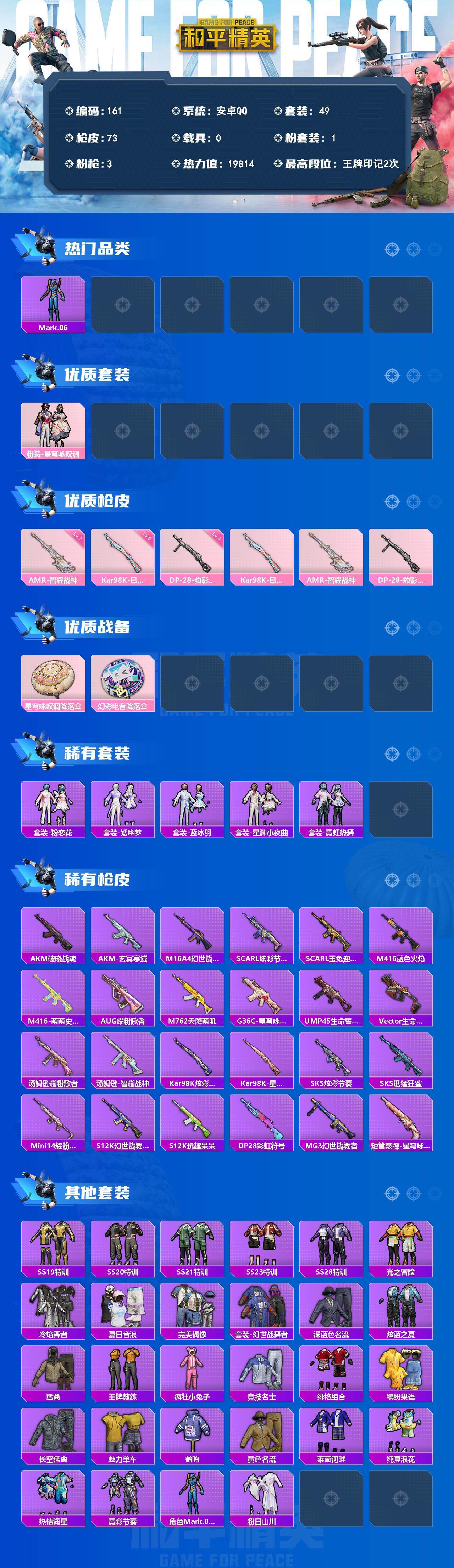 A1820安卓 手Q-1粉装-3特效枪-0载具-0粉色飞行器-19814热力值-2王牌印记-49套装-73枪皮