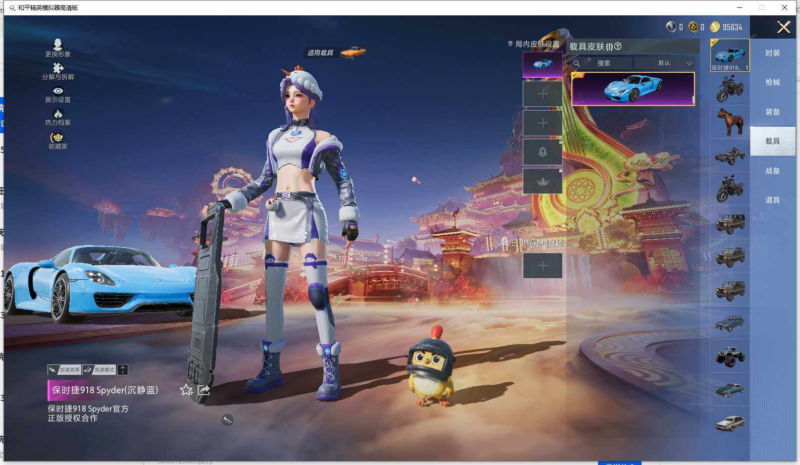时装数: 24 载具数: 1 枪械数: 35 战备数: 31 热门装扮: 异瞳寒姬 载具: 保时捷918Spyder(沉静蓝)