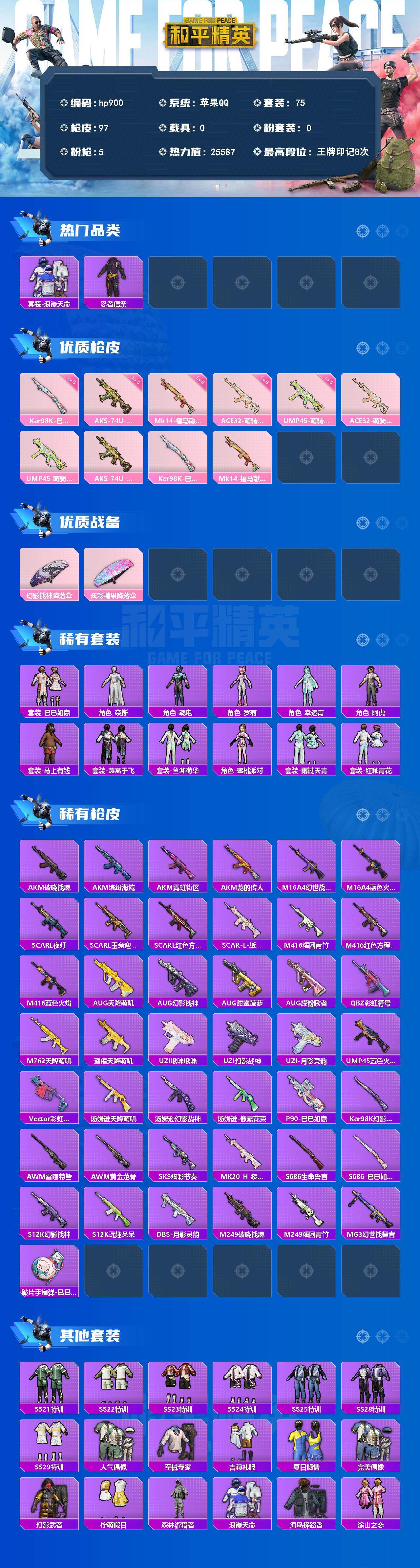 苹果 手Q-0粉装-5特效枪-0载具-0粉色飞行器-25587热力值-8王牌印记-75套装-97枪皮