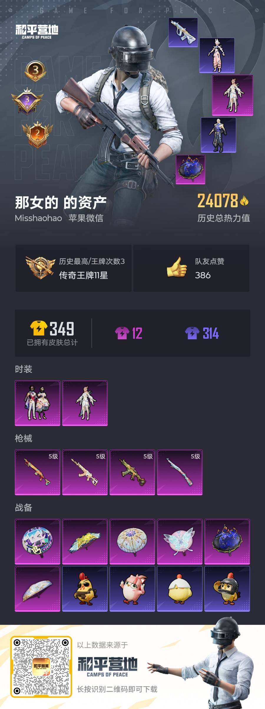 小女号!苹果 微信-2粉装-4特效枪-0载具-0粉色飞行器-24078热力值-3王牌印记-73套装-93枪皮