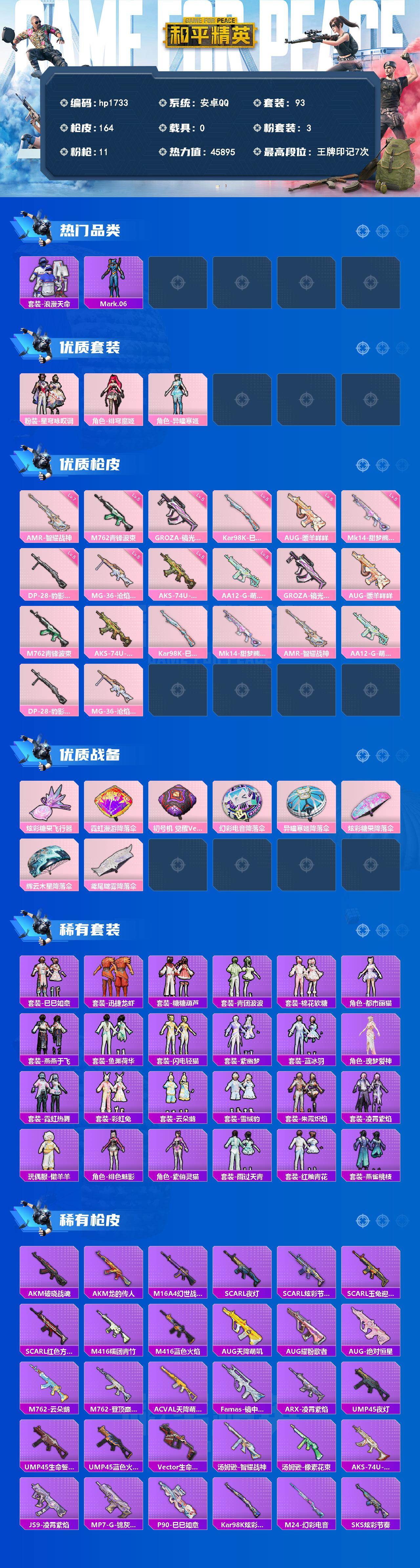 安卓 手Q-3粉装-11特效枪-0载具-1粉色飞行器-45895热力值-7王牌印记-93套装-164枪皮