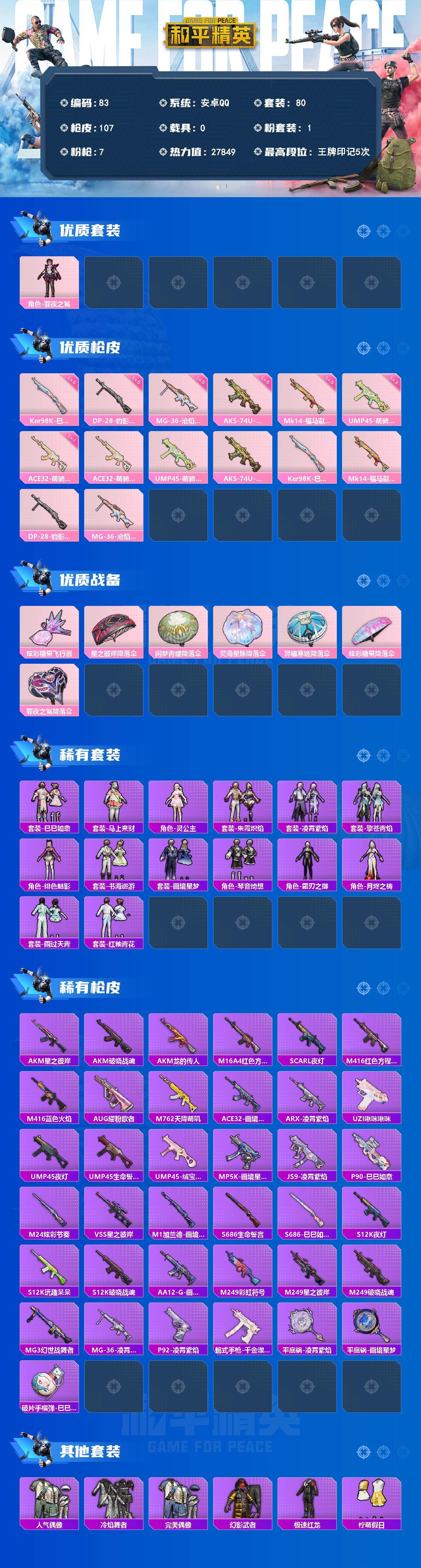 A1548安卓 手Q-1粉装-7特效枪-0载具-1粉色飞行器-27849热力值-5王牌印记-80套装-107枪皮