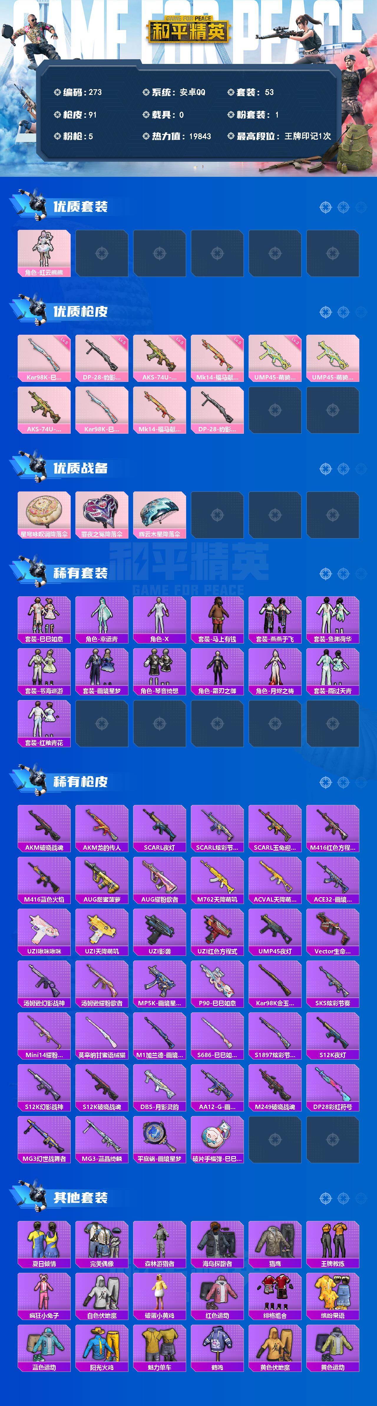 A1668安卓 手Q-1粉装-5特效枪-0载具-0粉色飞行器-19843热力值-1王牌印记-53套装-91枪皮