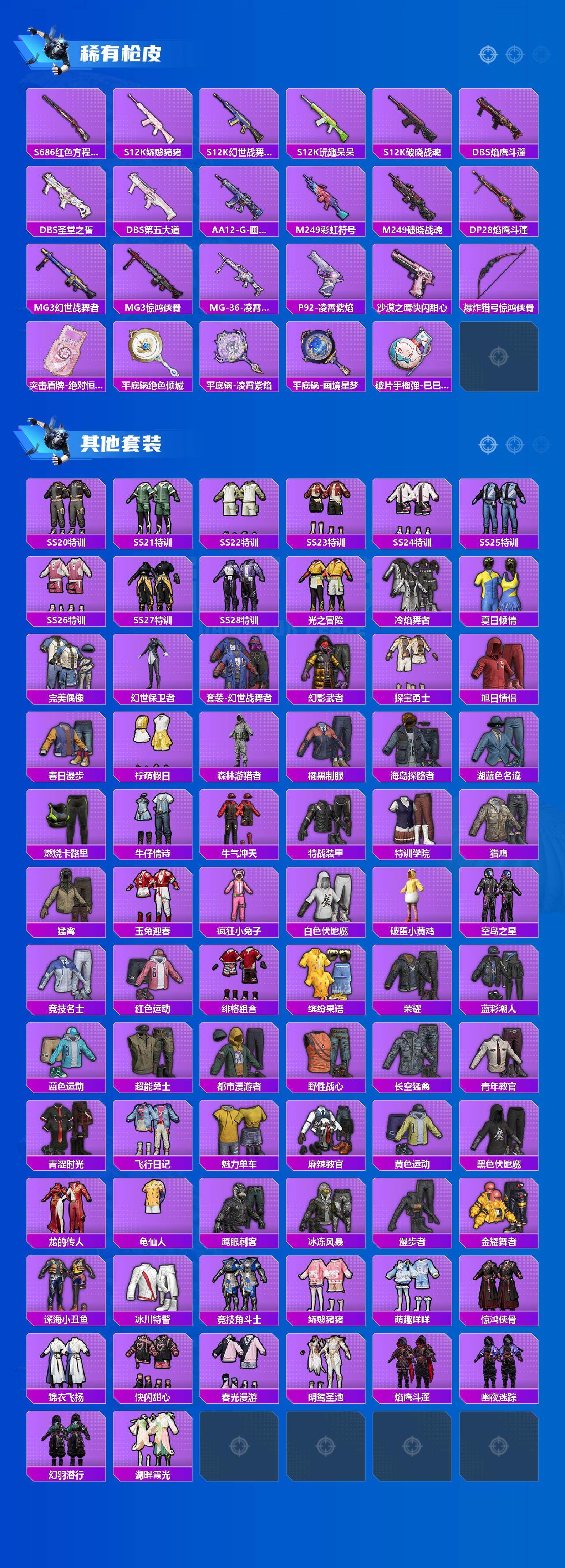 【粉色枪皮等级】:SCAR-L-锦绣绵绵(五级),AKS-74U-森灵之息(五级),Kar98K-巳巳如意(五级),Mk14-福马献瑞(五级),SPAS-12-蜜语绒猫(七级),DP-28-豹