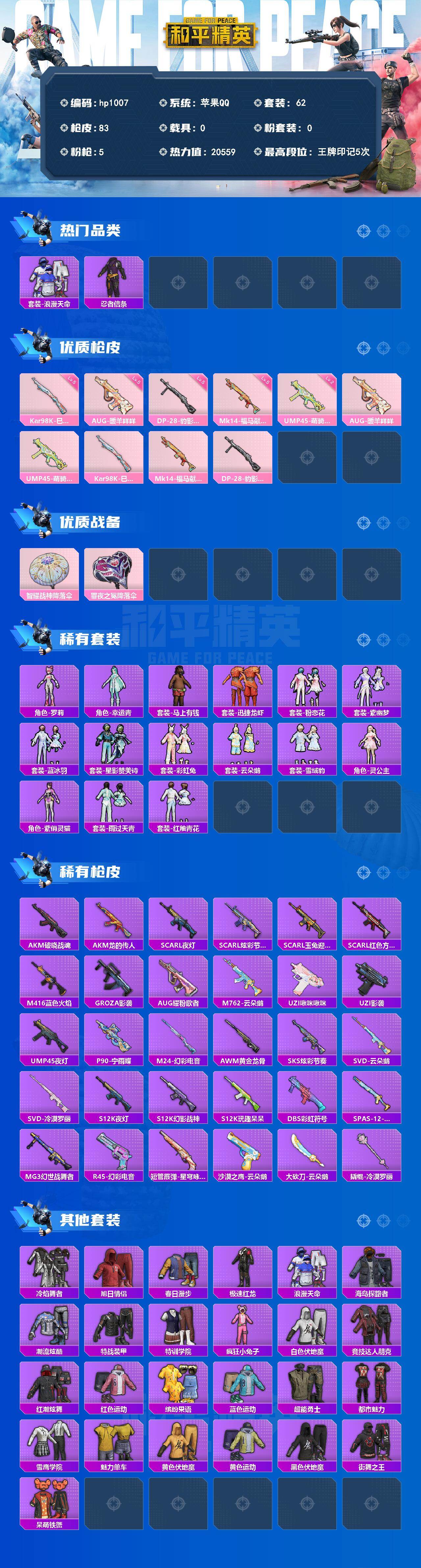 苹果 手Q-0粉装-5特效枪-0载具-0粉色飞行器-20559热力值-5王牌印记-62套装-83枪皮