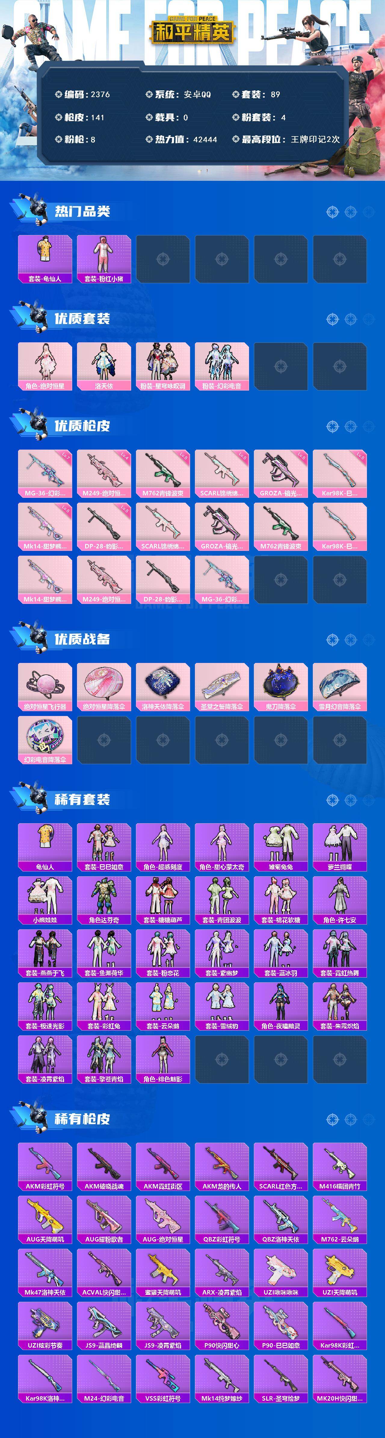 安卓 手Q-4粉装-8特效枪-0载具-1粉色飞行器-42444热力值-2王牌印记-89套装-141枪皮