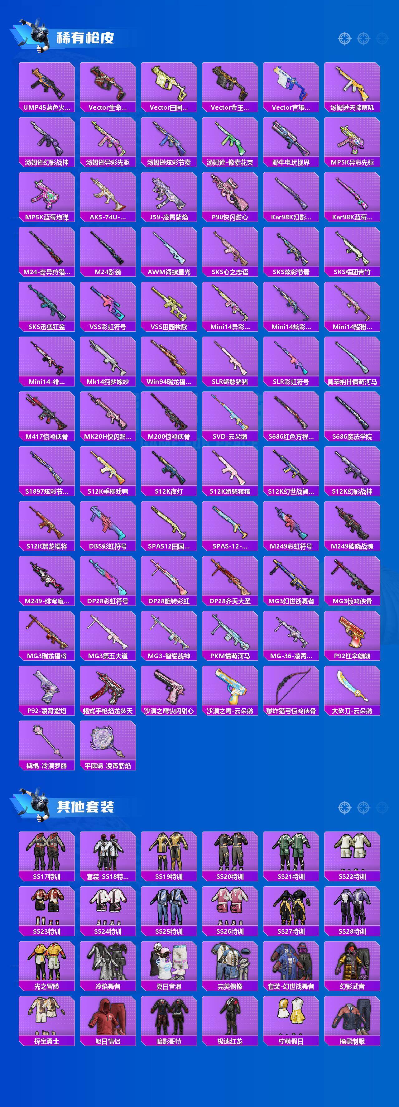 【粉色枪皮等级】:AKM-绿萝繁花(五级),SCAR-L-锦绣绵绵(五级),UMP45-萌骑冒险(四级),Mk14-福马献