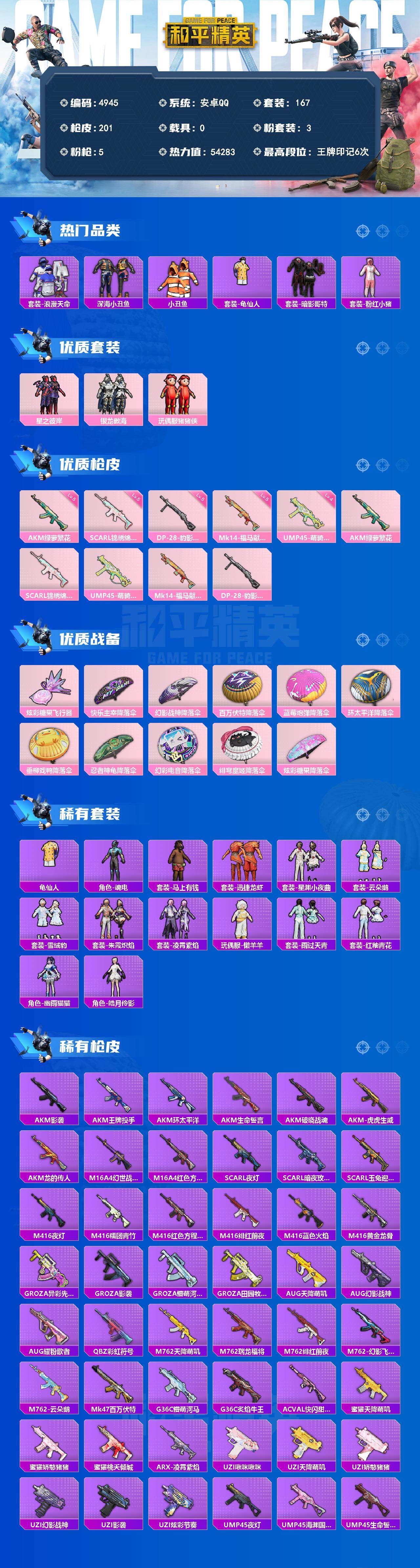 安卓 手Q-3粉装-5特效枪-0载具-1粉色飞行器-54283热力值-6王牌印记-167套装-201枪皮