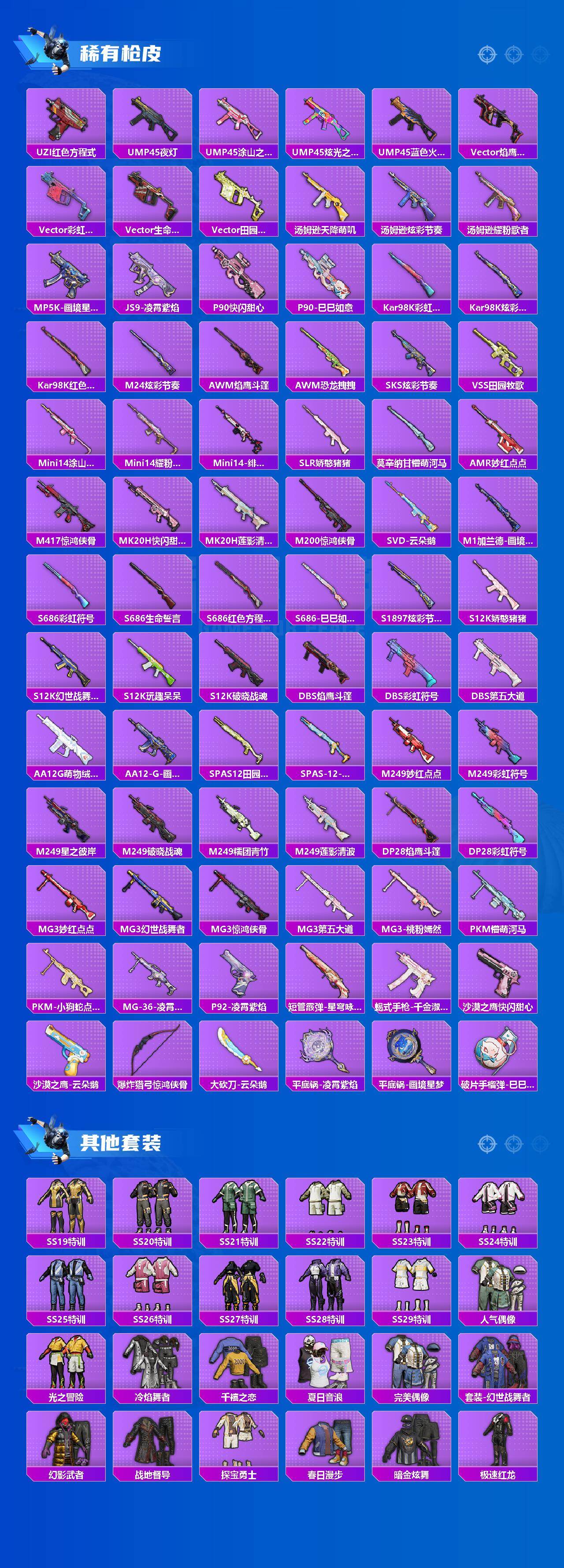 【粉色枪皮等级】:ACE32-萌骑漫游(五级),Kar98K-巳巳如意(五级),M24-莲影清波(二级),M417-第五大道(五级),DP-28-豹影疾电(五级),MG-36-幻彩电音