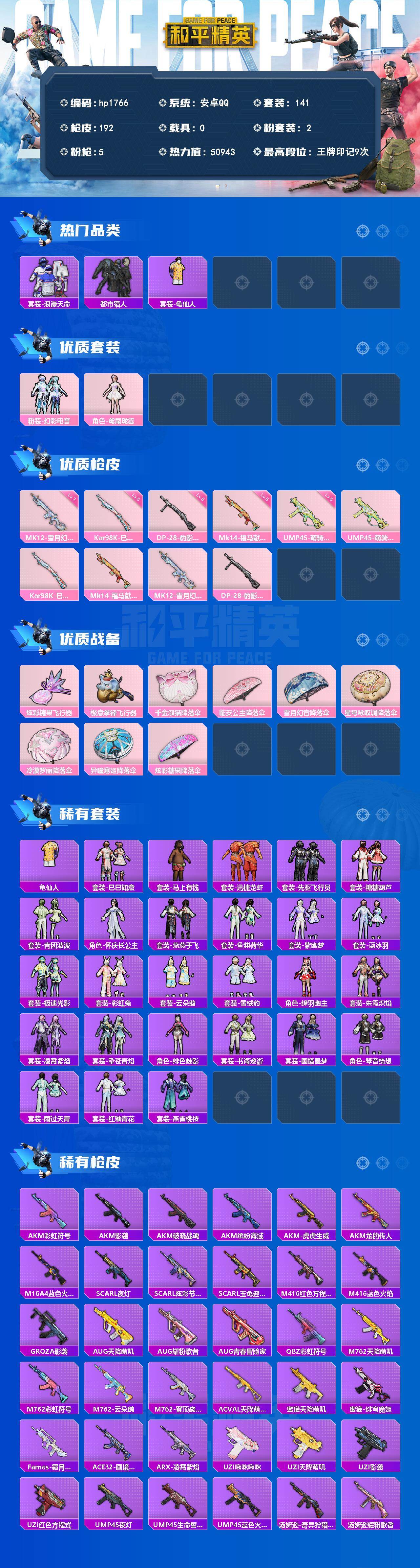 安卓 手Q-2粉装-5特效枪-0载具-2粉色飞行器-50943热力值-9王牌印记-141套装-192枪皮