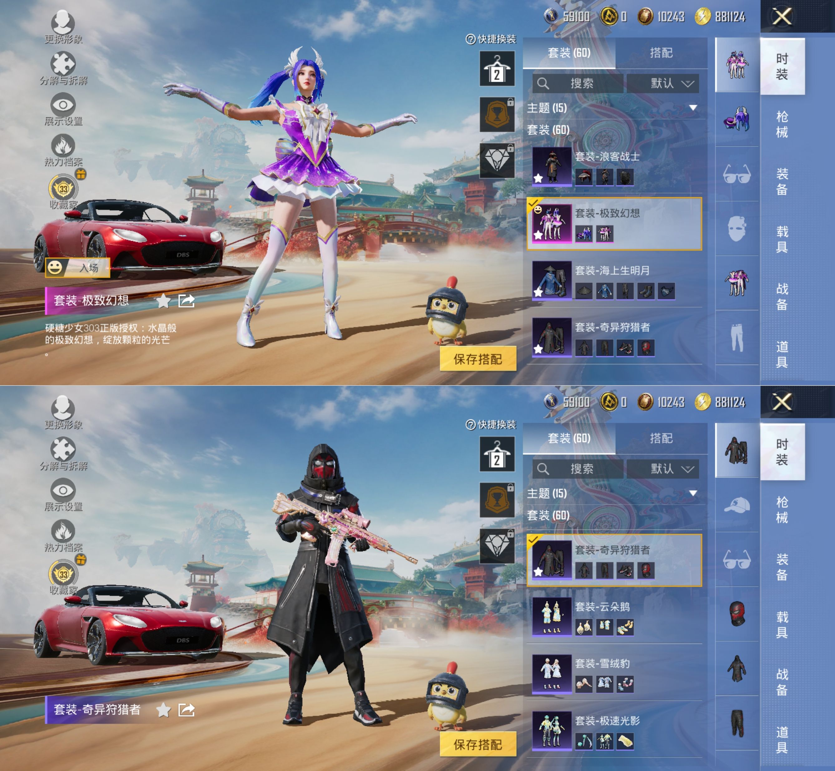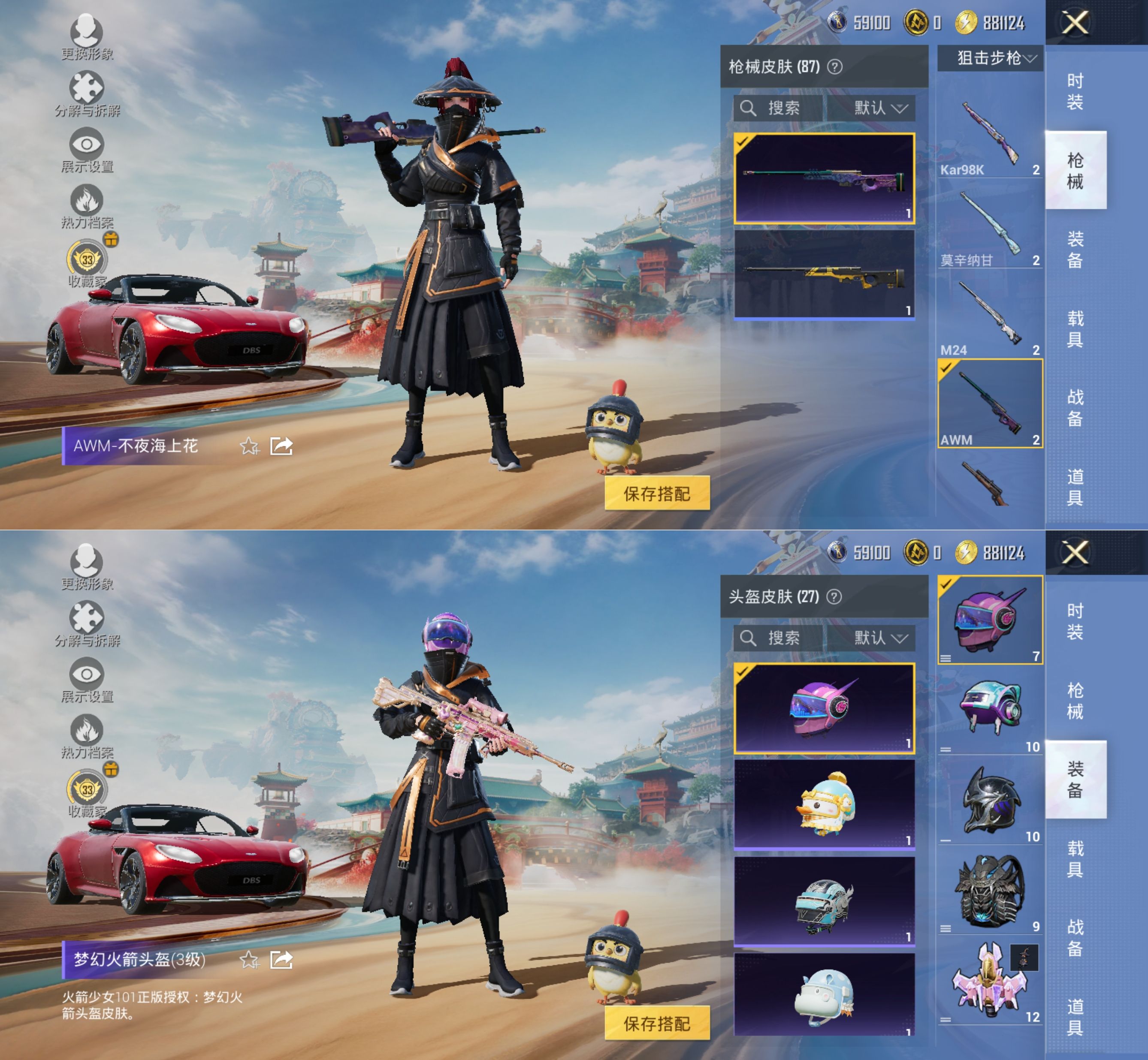 M1047170可二次【1载具-1粉装-2特效枪极致幻想 6级心之恋语 奇异狩猎 浪客战士】安卓手Q-1载具-1粉装-2特效枪-60套装-87枪皮-10王牌印记-坚韧铂金Ⅲ-28045热力值【1载具】阿斯顿·马丁DBS(红)【1粉装】极致幻想【2特效枪】M416-心之恋语[6级],Kar98K-伏魔团[4级]【8稀有】奇异狩猎者,浪客战士,S686-浪客战士,汤姆逊-奇异狩猎者,S686-奇异狩