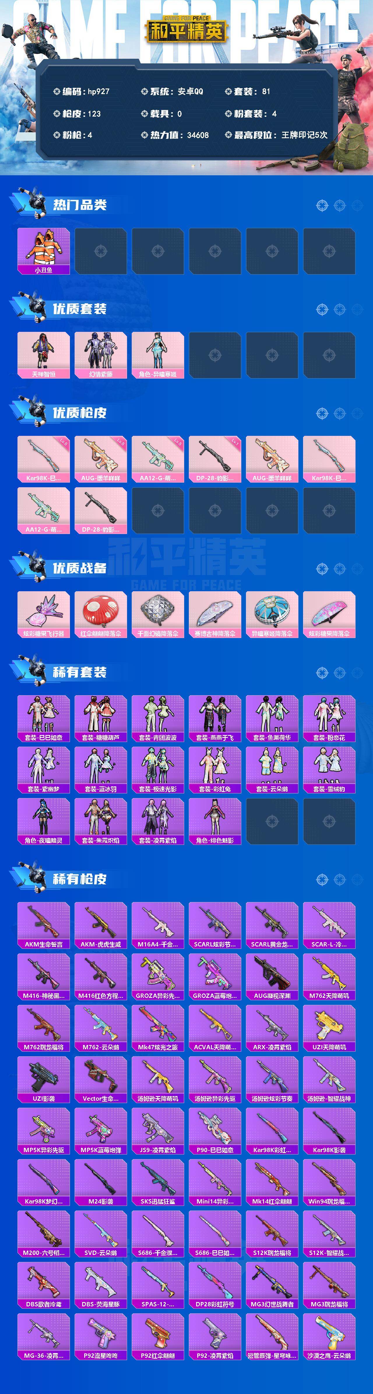 安卓 手Q-4粉装-4特效枪-0载具-1粉色飞行器-34608热力值-5王牌印记-81套装-123枪皮