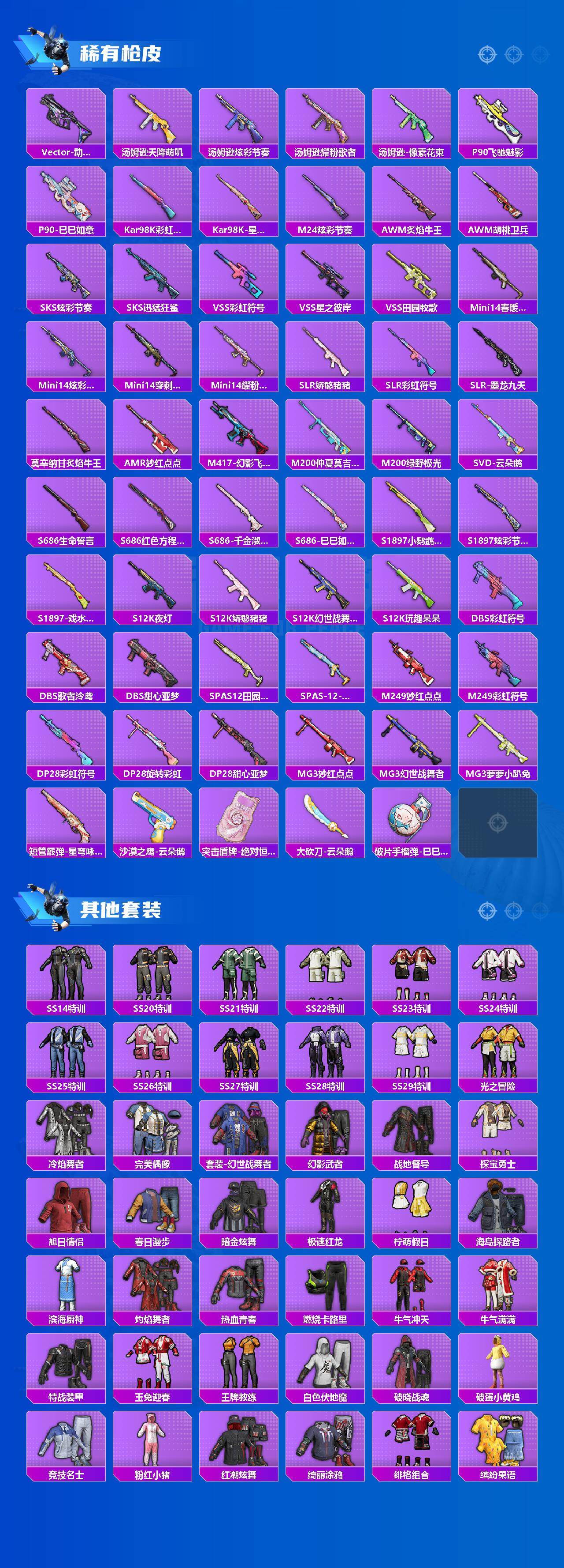 【粉色枪皮等级】:AUG-暖羊咩咩(五级),M762-青锋波束(五级),AKS-74U-星穹咏叹调(七级),Kar98K-巳巳如意(五级),Mk14-甜梦熊击(五级)