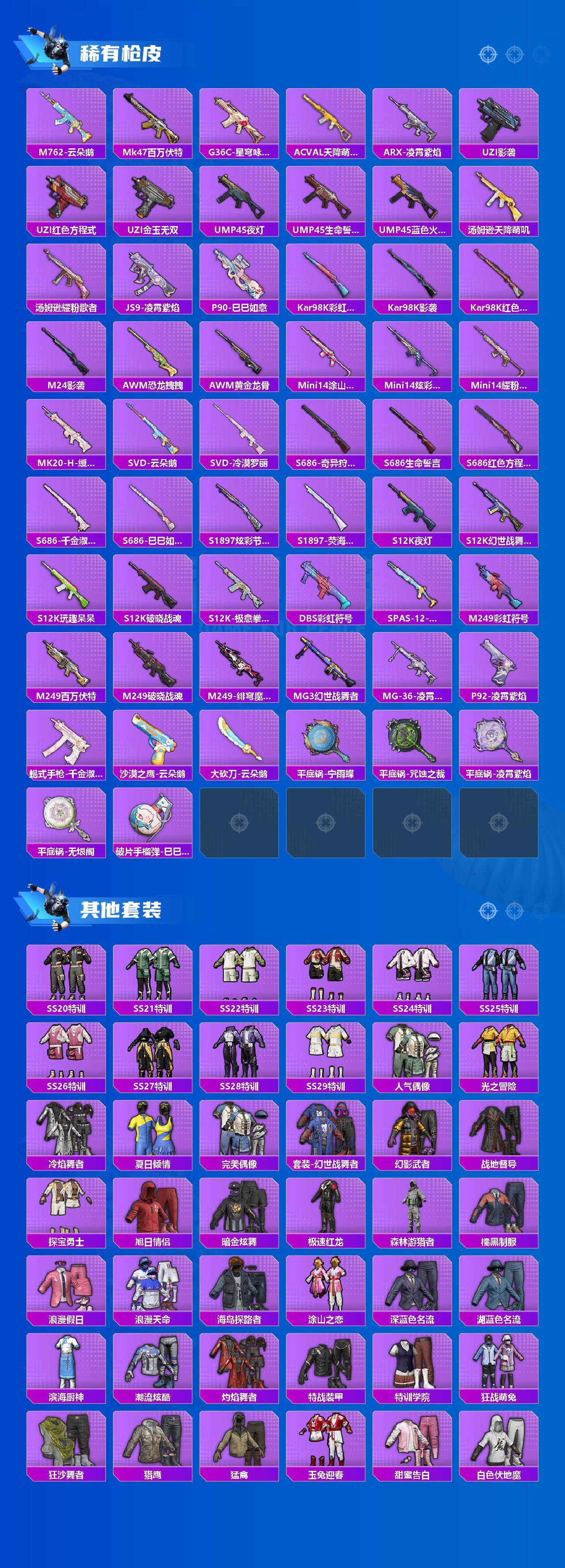 【粉色枪皮等级】:GROZA-镜光银凌(五级),M762-青锋波束(五级),ACE32-萌骑漫游(五级),Kar98K-巳巳如意(五级