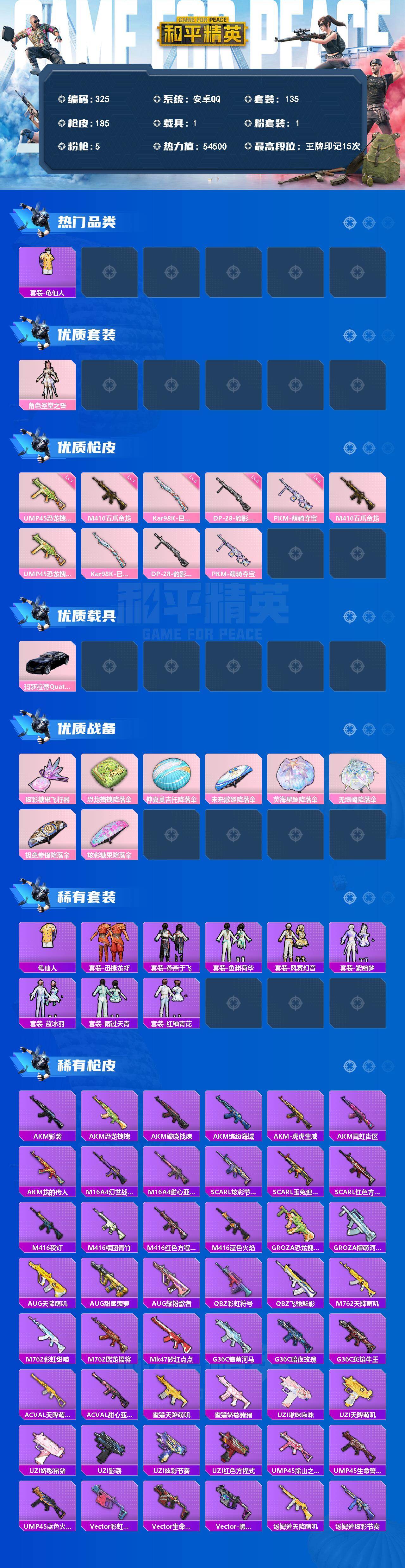 A1940安卓 手Q-1粉装-5特效枪-1载具-1粉色飞行器-54500热力值-15王牌印记-135套装-185枪皮