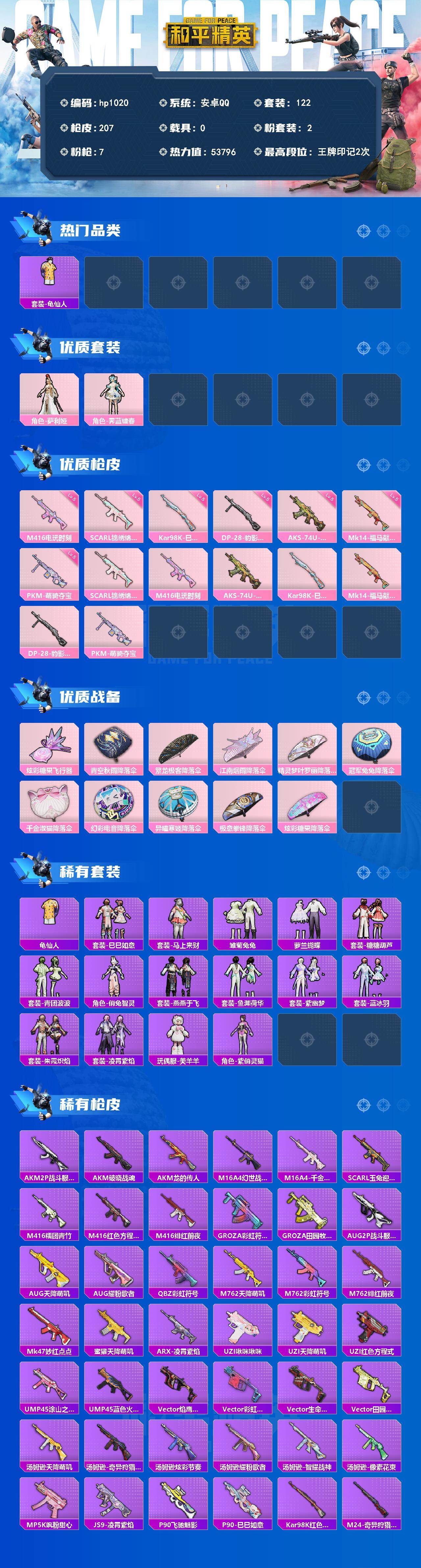 安卓 手Q-2粉装-7特效枪-0载具-1粉色飞行器-53796热力值-2王牌印记-122套装-207枪皮