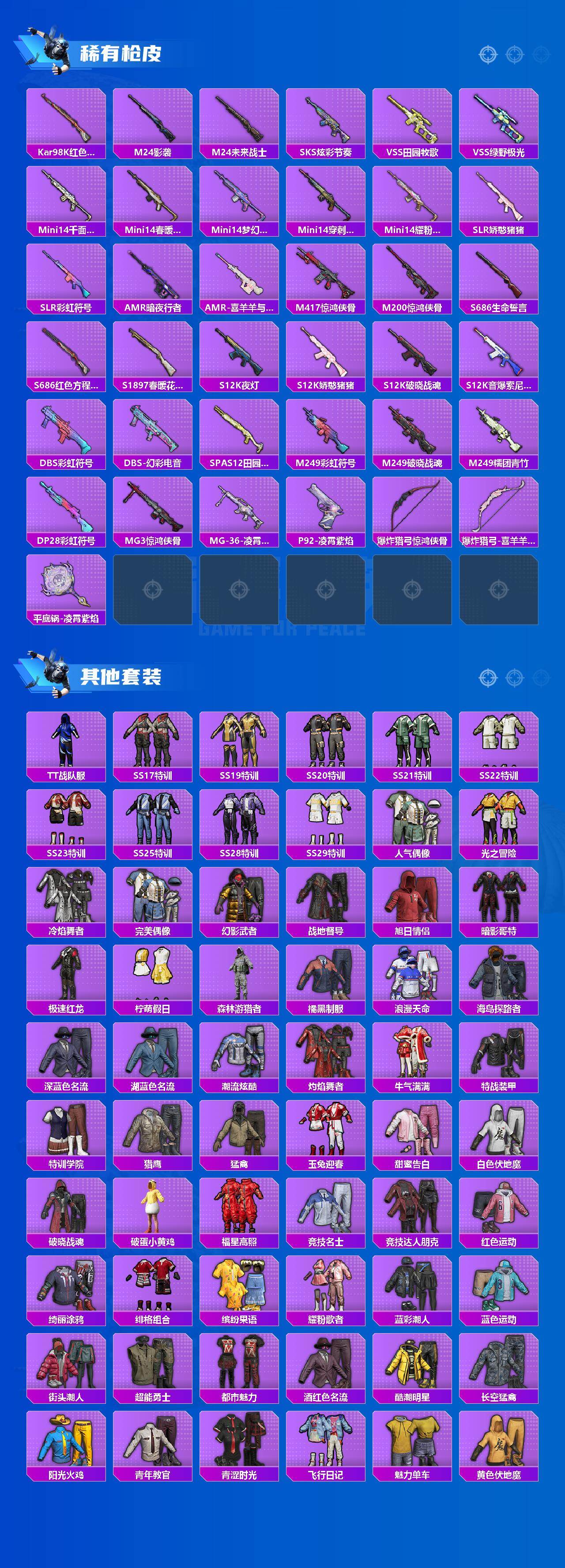 【粉色枪皮等级】:AKS-74U-森灵之息(五级),Kar98K-巳巳如意(五级),DP-28-豹影疾电(五级),MG-36-沧焰双生(五级)