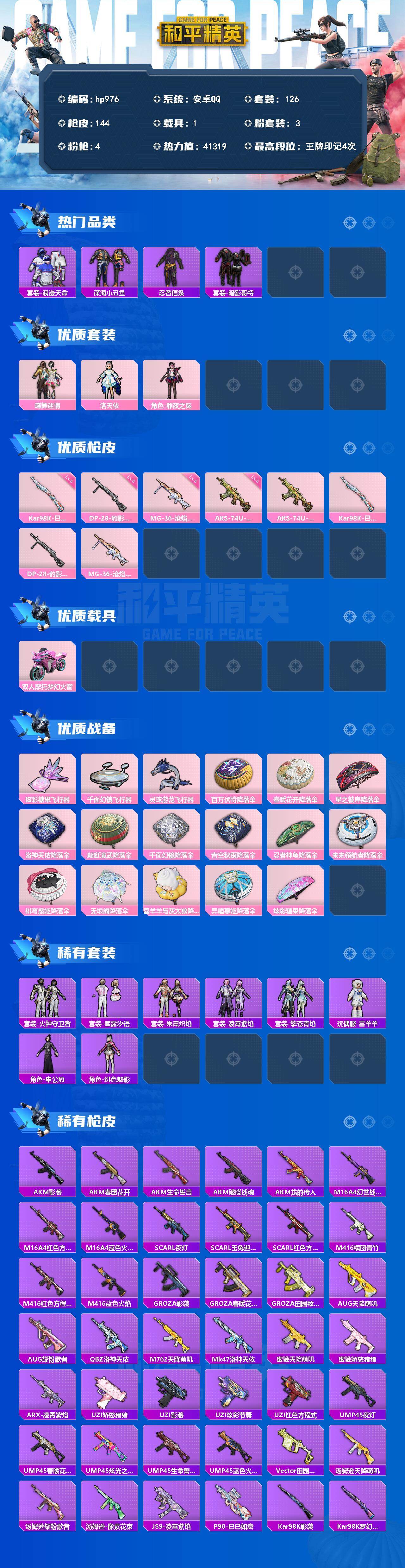 安卓 手Q-3粉装-4特效枪-1载具-3粉色飞行器-41319热力值-4王牌印记-126套装-144枪皮