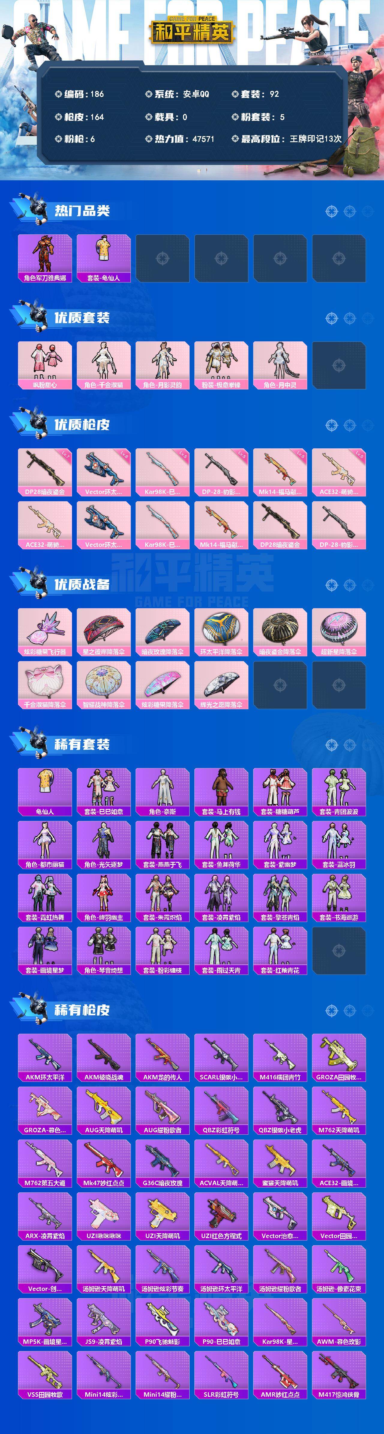 A1865安卓 手Q-5粉装-6特效枪-0载具-1粉色飞行器-47571热力值-13王牌印记-92套装-164枪皮