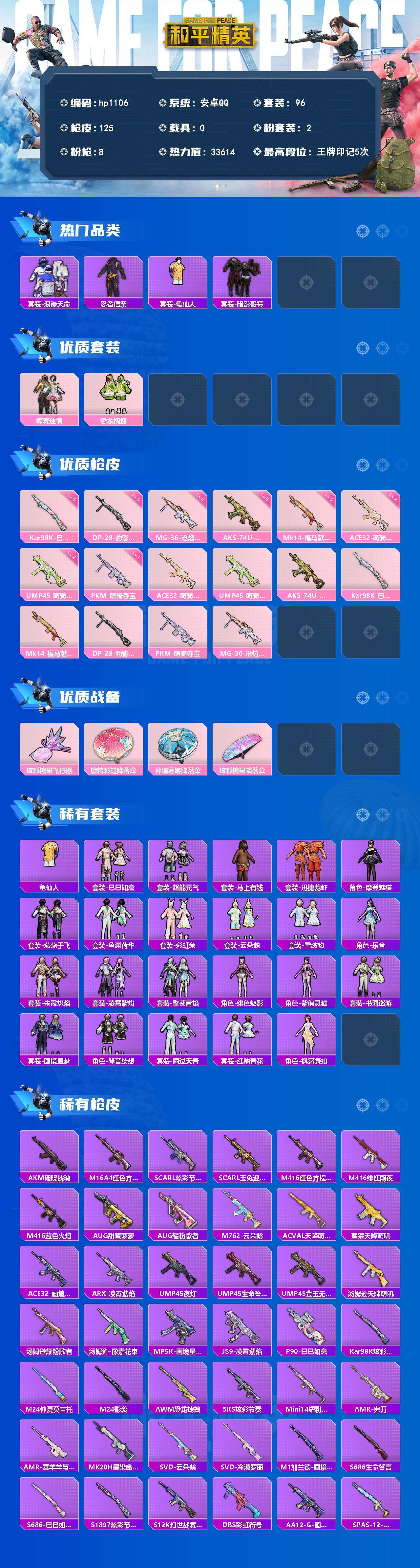 安卓 手Q-2粉装-8特效枪-0载具-1粉色飞行器-33614热力值-5王牌印记-96套装-125枪皮