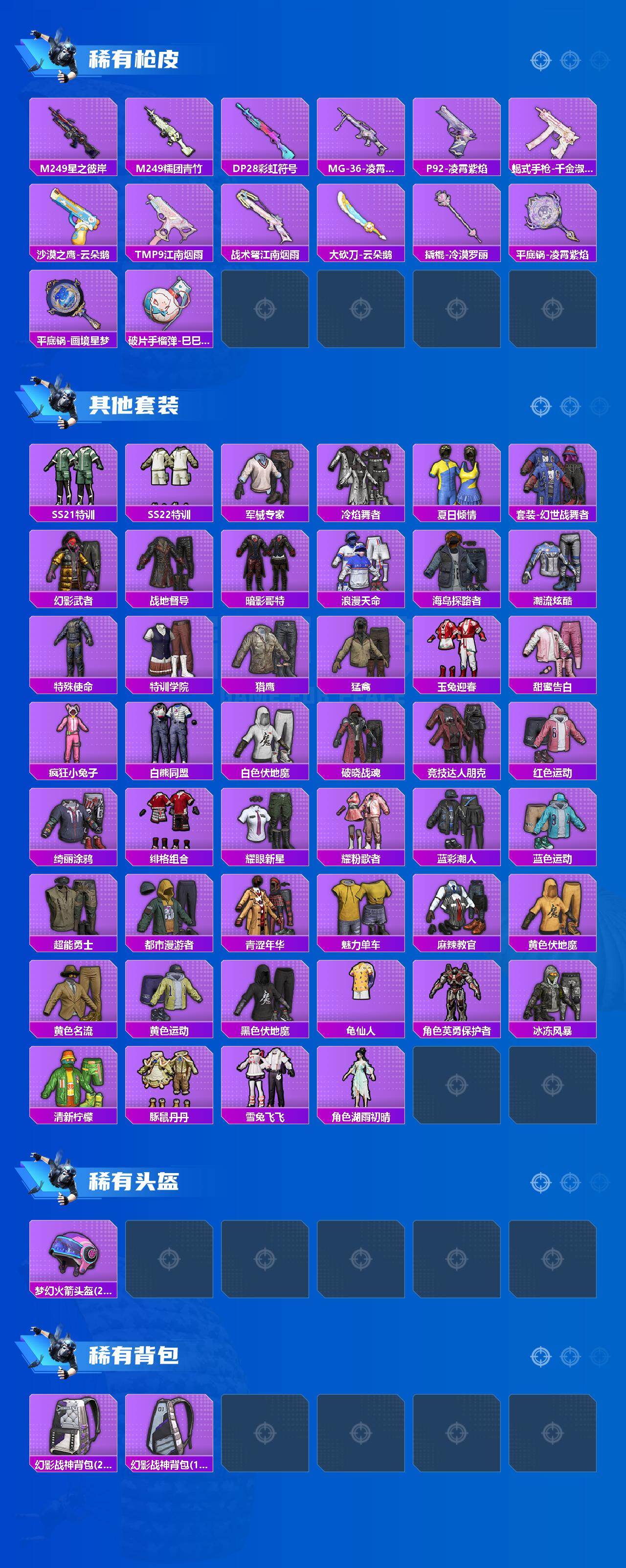 【粉色枪皮等级】:ACE32-萌骑漫游(二级),UMP45-萌骑冒险(二级),AKS-74U-森灵之息(五级),Kar98K-巳巳如意(五级),Mk14-福马献瑞(五级),