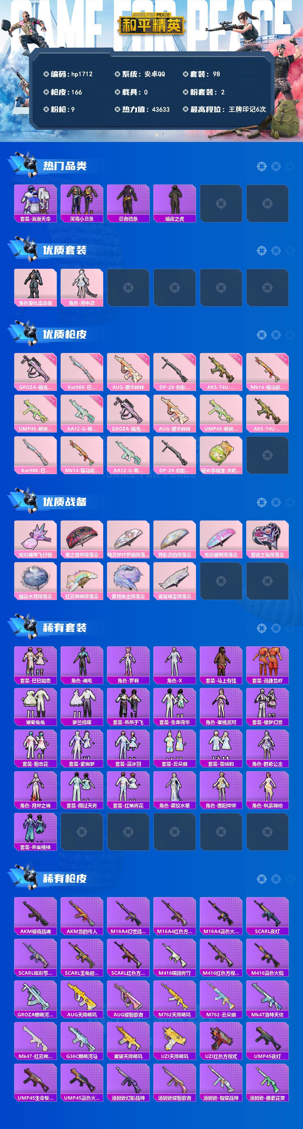 安卓 手Q-2粉装-9特效枪-0载具-1粉色飞行器-43633热力值-6王牌印记-98套装-166枪皮