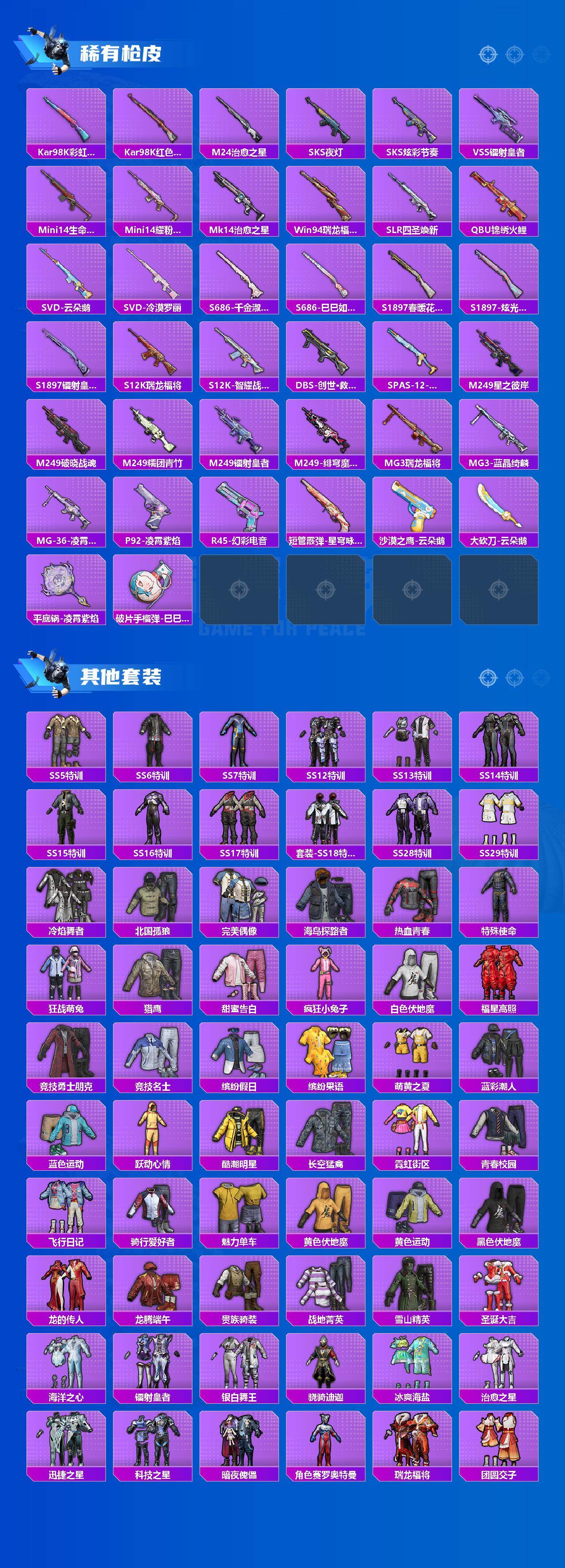 【粉色枪皮等级】:M416-电玩时刻(五级),GROZA-镜光银凌(五级),UMP45-萌骑冒险(五级),AKS-74U-森灵之息(五级),Kar98K-巳巳如意(五级)