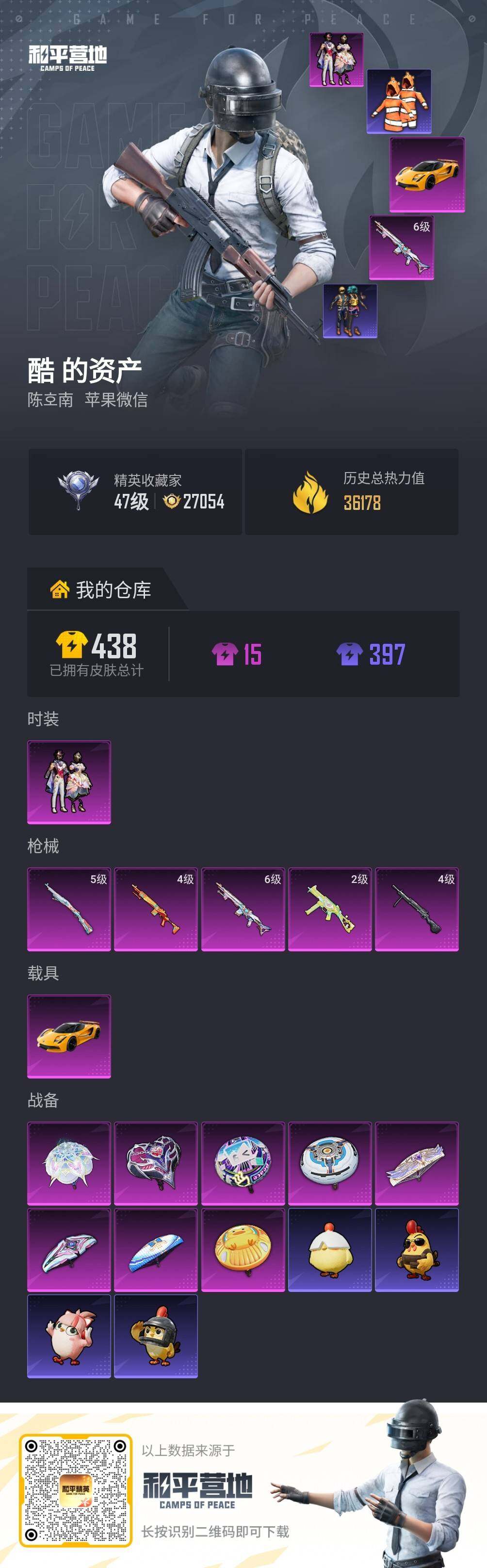 苹果 微信-1粉装-5特效枪-1载具-0粉色飞行器-36178热力值-1王牌印记-103套装-130枪皮