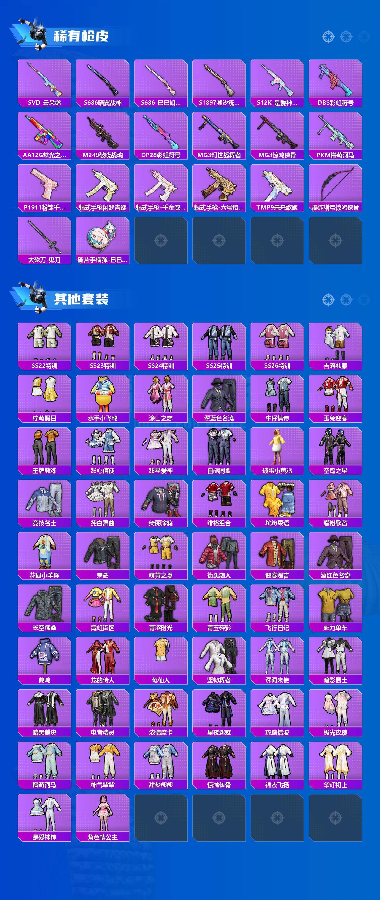 【粉色枪皮等级】:GROZA-镜光银凌(五级),P90-甜蜜草莓(七级),Kar98K-巳巳如意(五级),DP-28-圣堂之誓(七级),DP-28-豹影疾电(五级