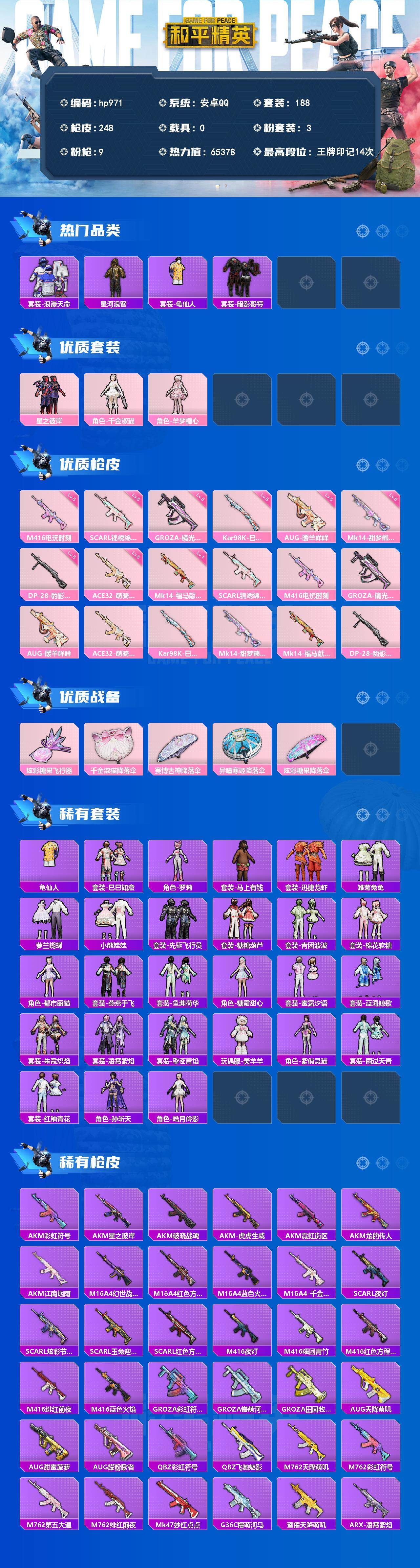 安卓 手Q-3粉装-9特效枪-0载具-1粉色飞行器-65378热力值-14王牌印记-188套装-248枪皮