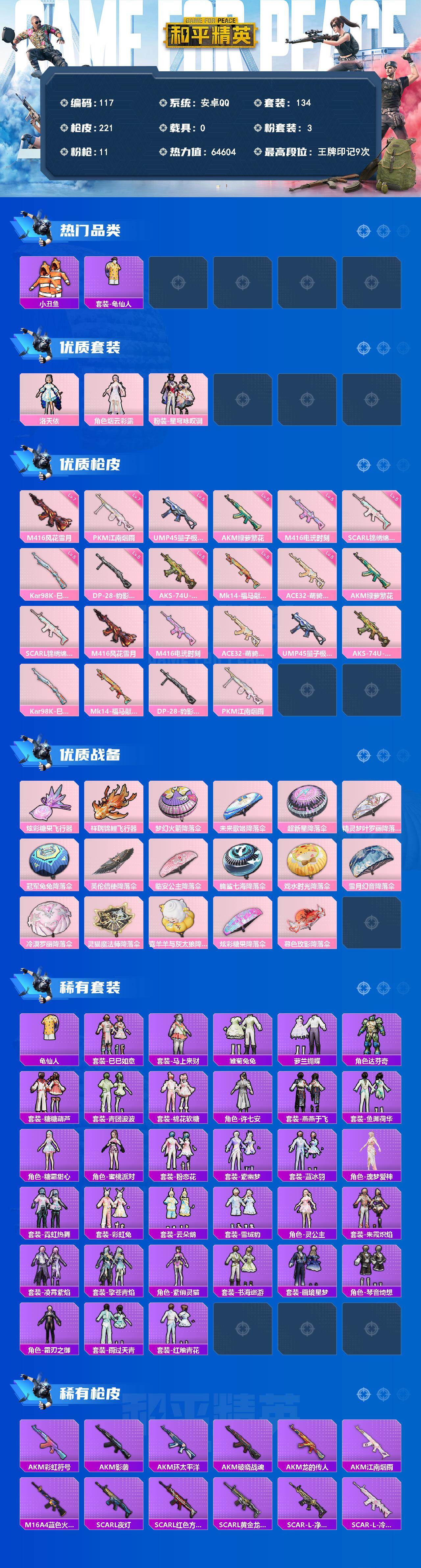 A1709安卓 手Q-3粉装-11特效枪-0载具-2粉色飞行器-64604热力值-9王牌印记-134套装-221枪皮