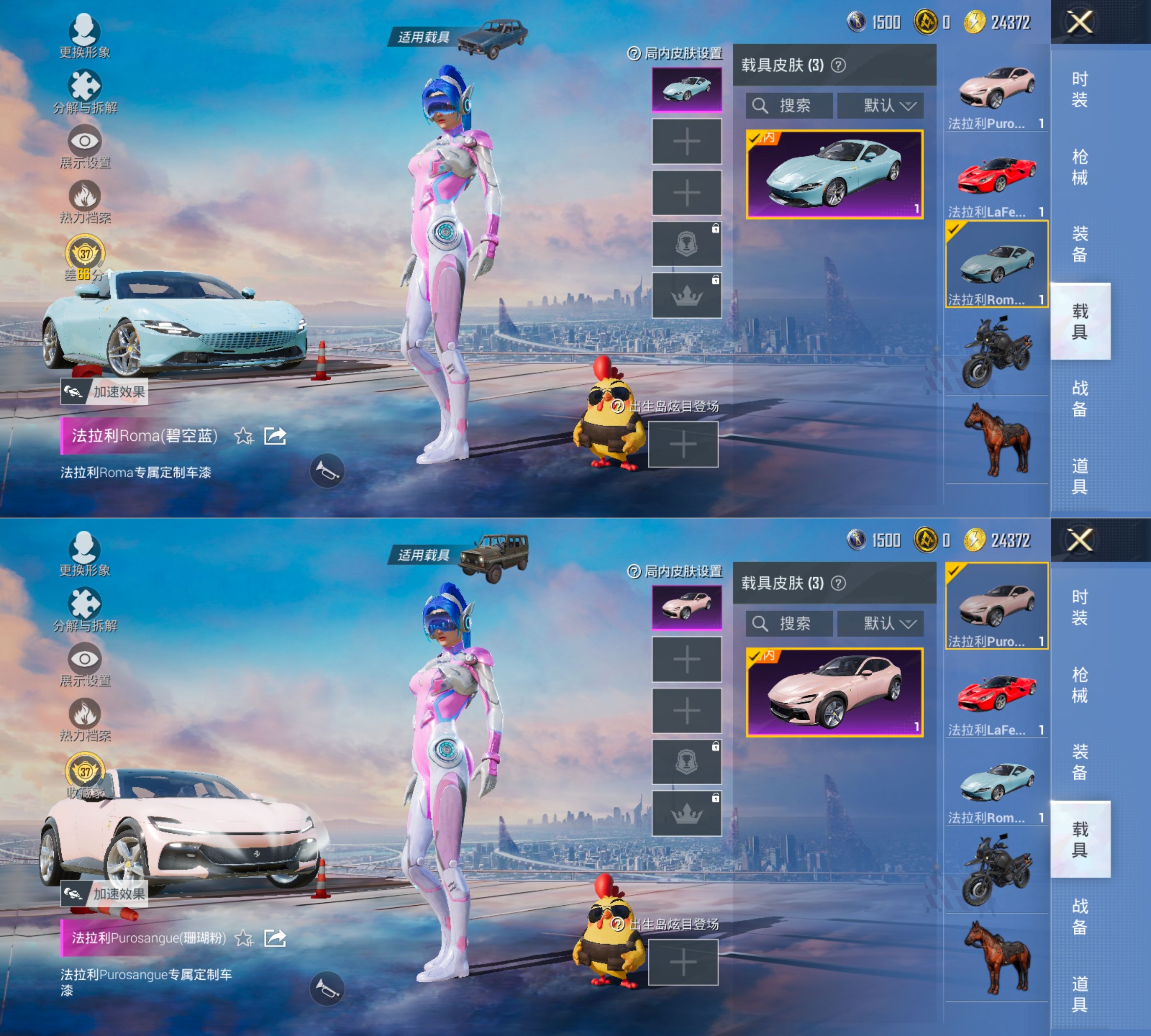 DSH2466【梦幻火箭3载具-2粉装-2特效枪】安卓手Q-3载具-2粉装-2特效枪-71套装-95枪皮-0王牌印记-坚韧铂金Ⅱ-26207热力值【3载具】法拉利LaFerrari(赛车红),法拉利Purosangue(珊瑚粉),法拉利Roma(碧空蓝)【2粉装】角色-虎痴许褚,梦幻火箭【2特效枪】Kar98K-巳巳如意[5级],DP-28-豹影疾电[5级]【2飞行器】粉色滑翔尾迹,顶峰精英尾迹