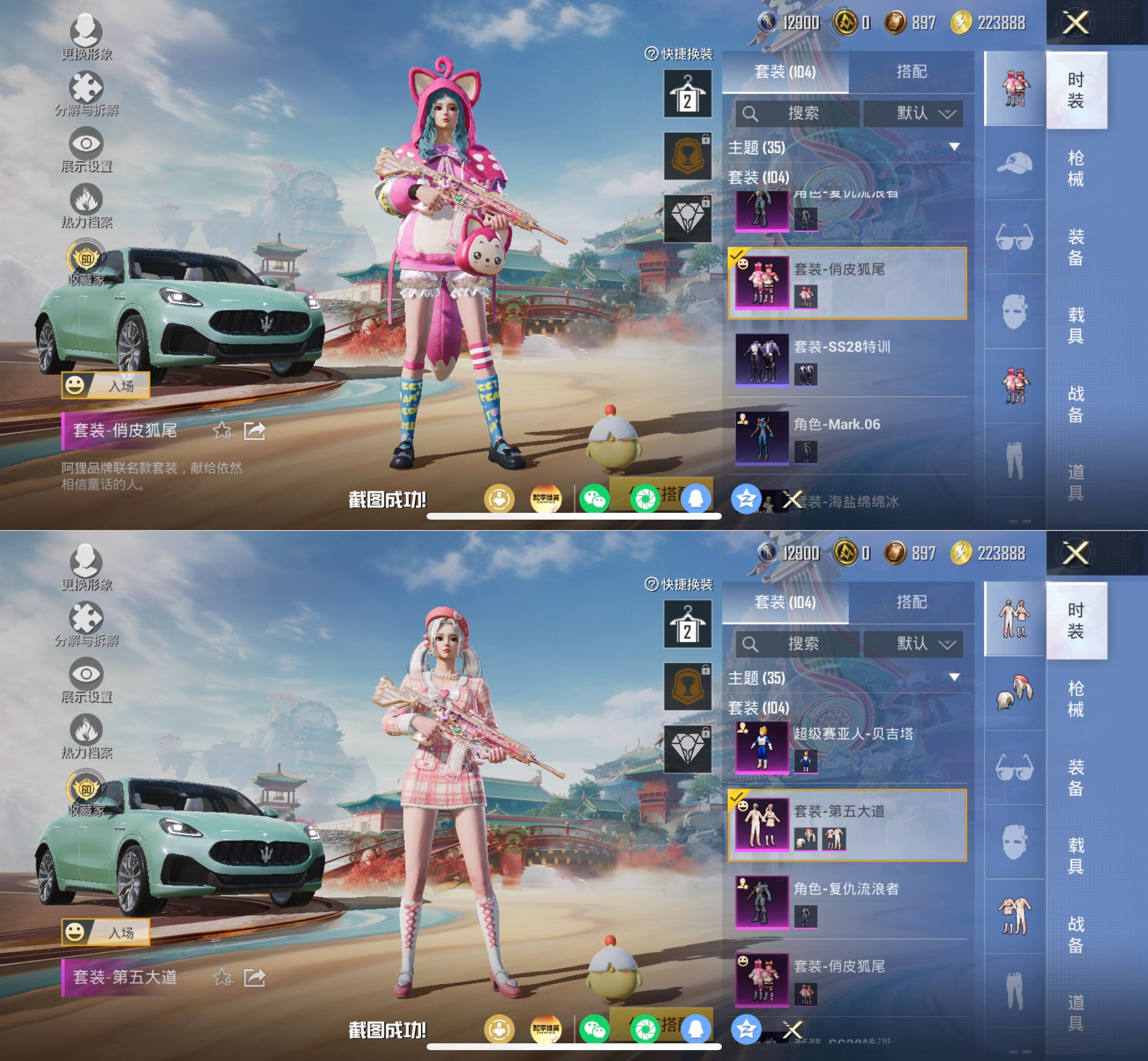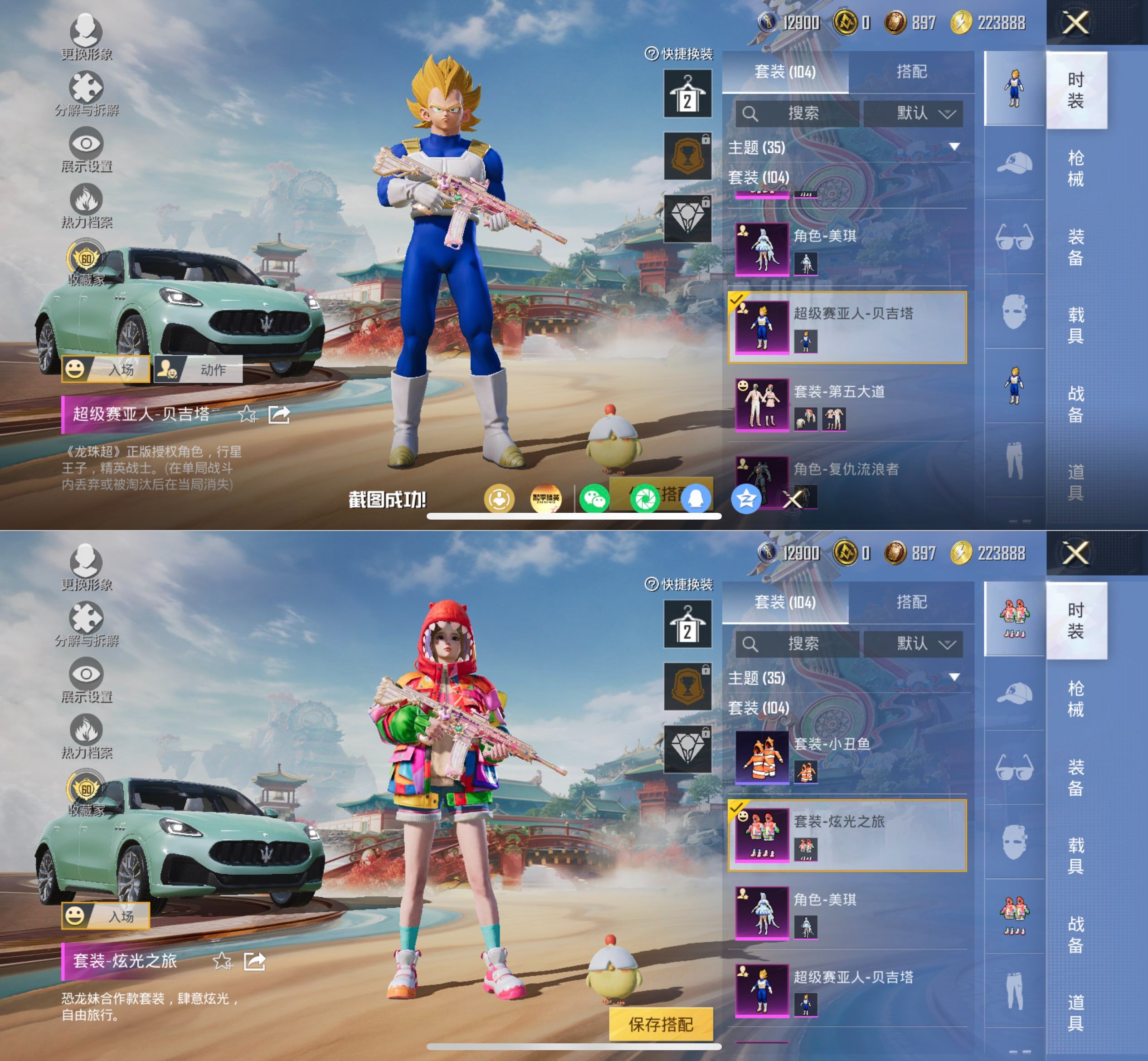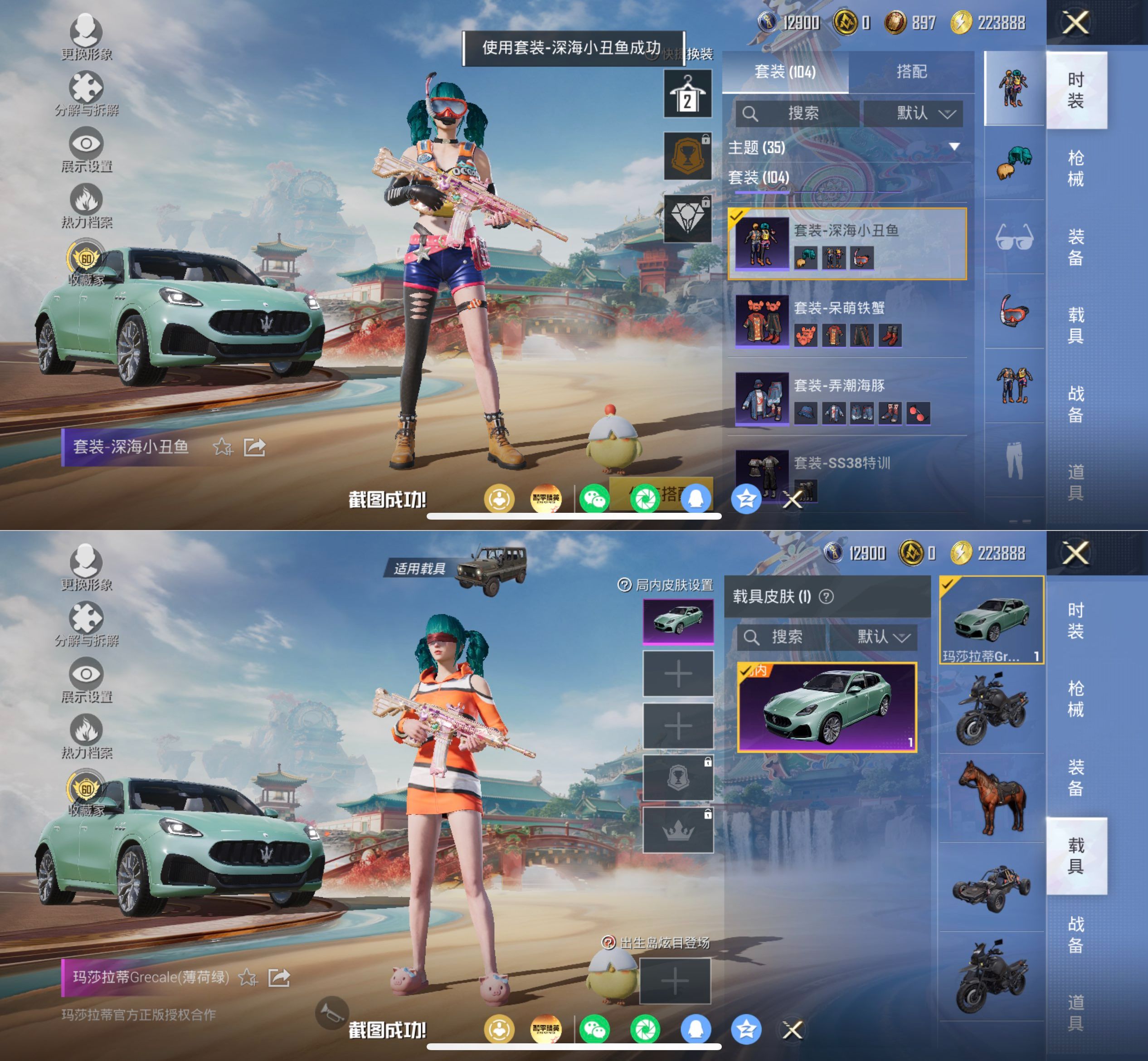 M1047353有二次【身法号1载具-6粉装-5特效枪 超级赛亚人-贝吉塔 深海小丑鱼,小丑鱼,暗影哥特】 苹果手Q-1载具-6粉装-5特效枪-104套装-168枪皮-9王牌印记-坚韧铂金Ⅳ-51047热力值【1载具】玛莎拉蒂Grecale(薄荷绿)【6粉装】超级赛亚人-贝吉塔,角色-美琪,炫光之旅,角色-复仇流浪者,俏皮狐尾,第五大道【5特效枪】M416-心之恋语[7级],UMP45-恐龙拽拽