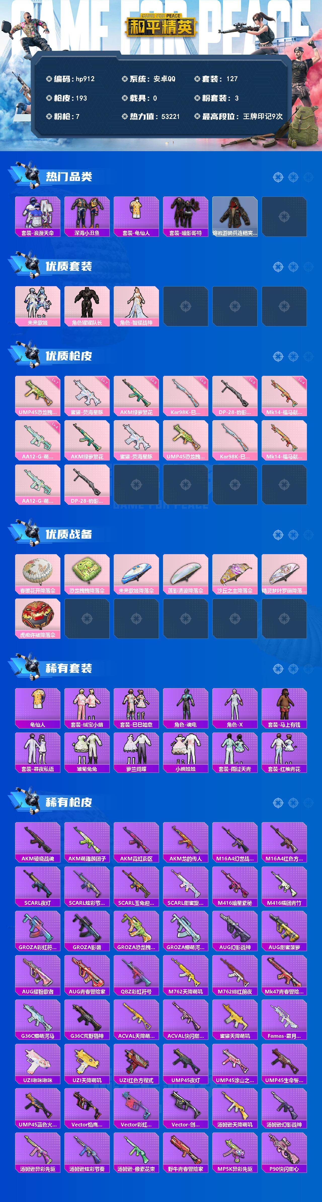 安卓 手Q-3粉装-7特效枪-0载具-0粉色飞行器-53221热力值-9王牌印记-127套装-193枪皮