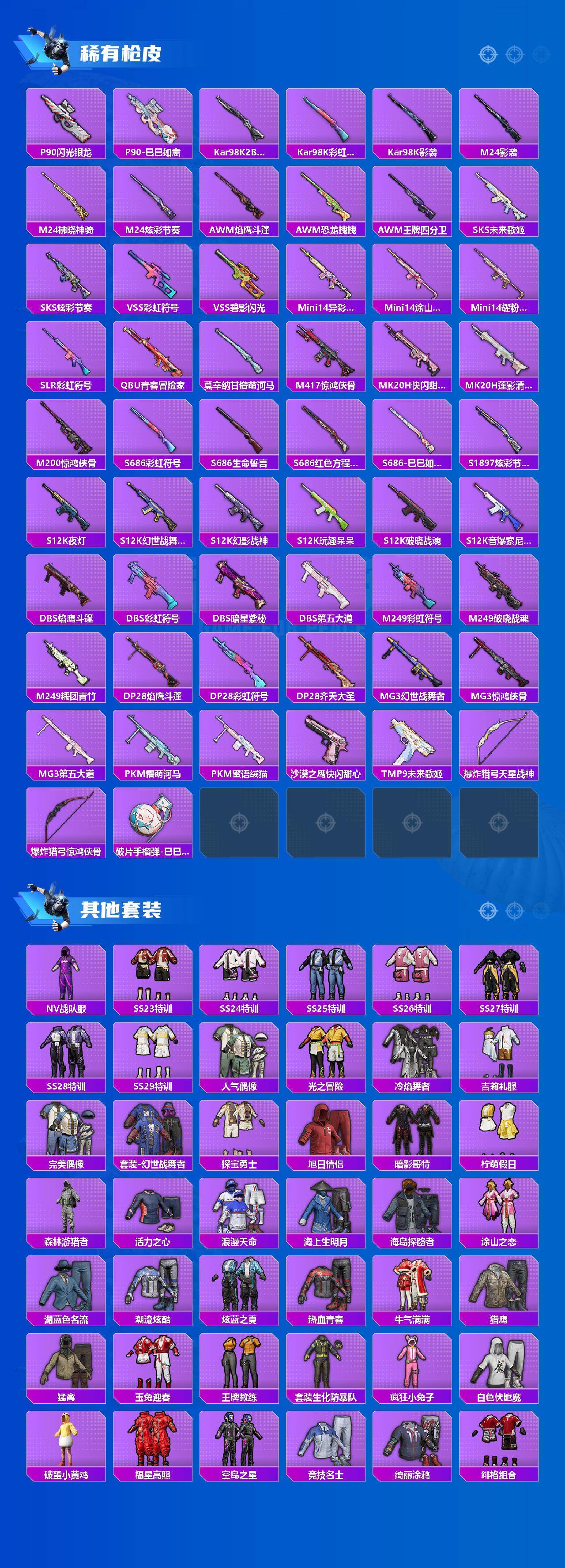 【粉色枪皮等级】:AKM-绿萝繁花(五级),蜜獾-荧海星豚(七级),UMP45-恐龙拽拽(七级),Kar98K-巳巳如意(五级),M