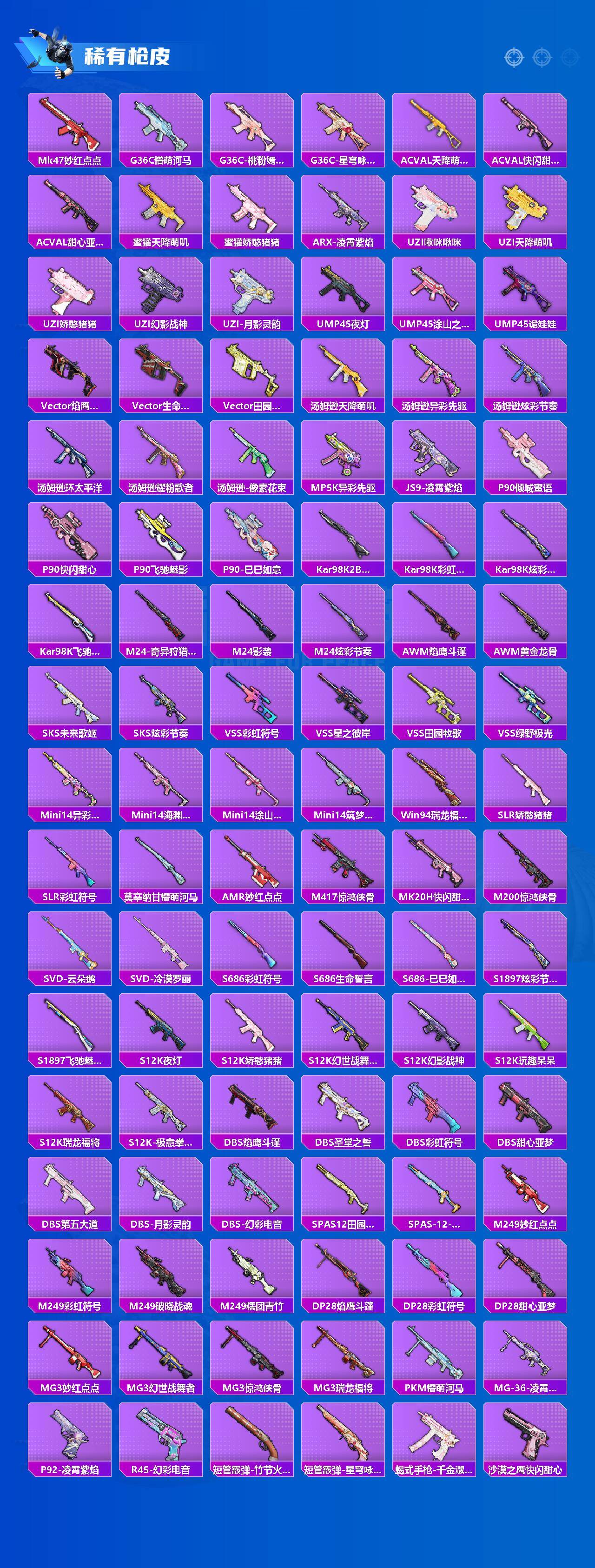 【粉色枪皮等级】:AKM-绿萝繁花(五级),SCAR-L-锦绣绵绵(五级),M416-电玩时刻(五级),GROZA-镜光银凌(五级),Vector-飒粉甜心(七级),