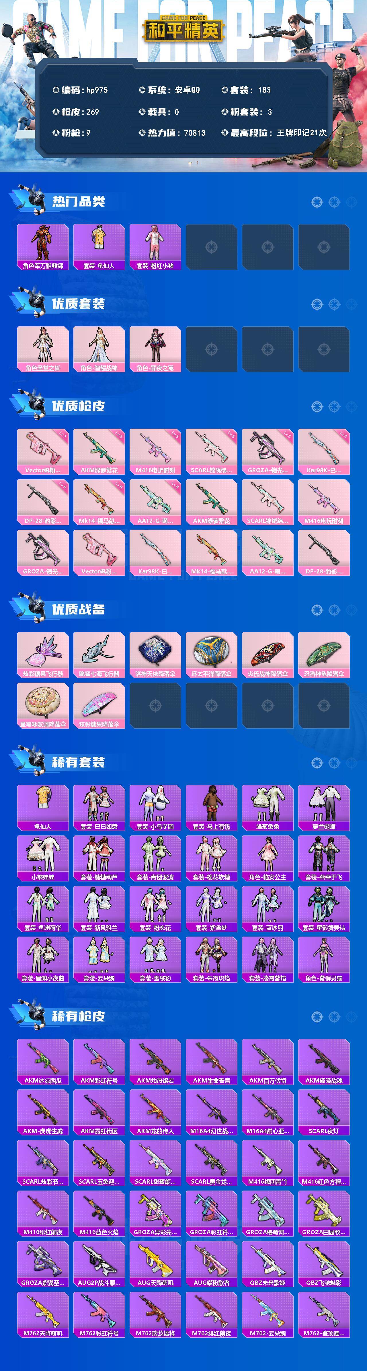 安卓 手Q-3粉装-9特效枪-0载具-2粉色飞行器-70813热力值-21王牌印记-183套装-269枪皮
