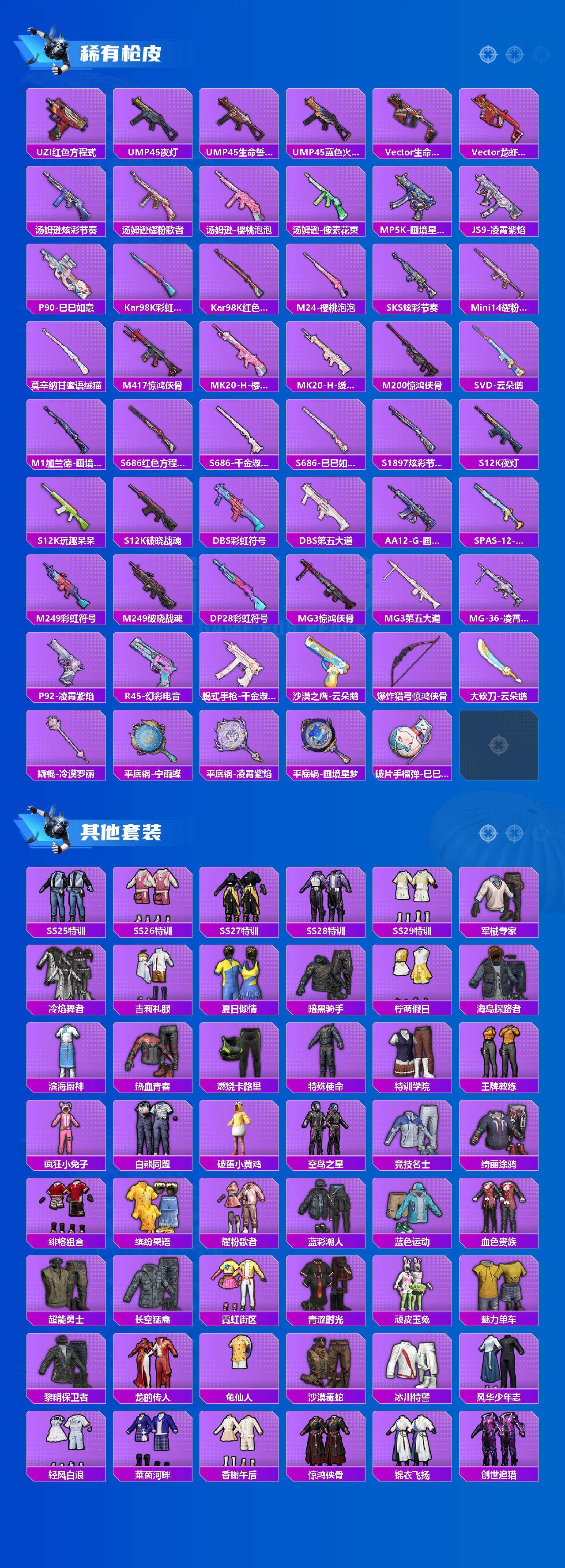 【粉色枪皮等级】:GROZA-镜光银凌(五级),ACE32-萌骑漫游(二级),Kar98K-巳巳如意(五级),Mk14-樱桃泡泡(三级),Mk14-甜梦熊击(五级),Mk14-福马献瑞(五级),M41