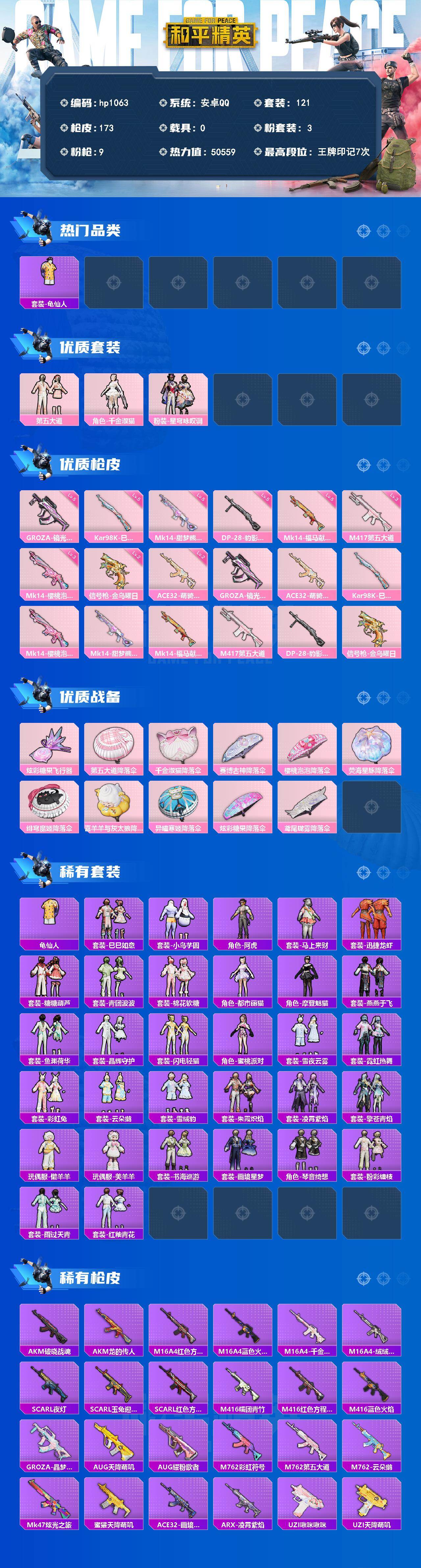 安卓 手Q-3粉装-9特效枪-0载具-1粉色飞行器-50559热力值-7王牌印记-121套装-173枪皮