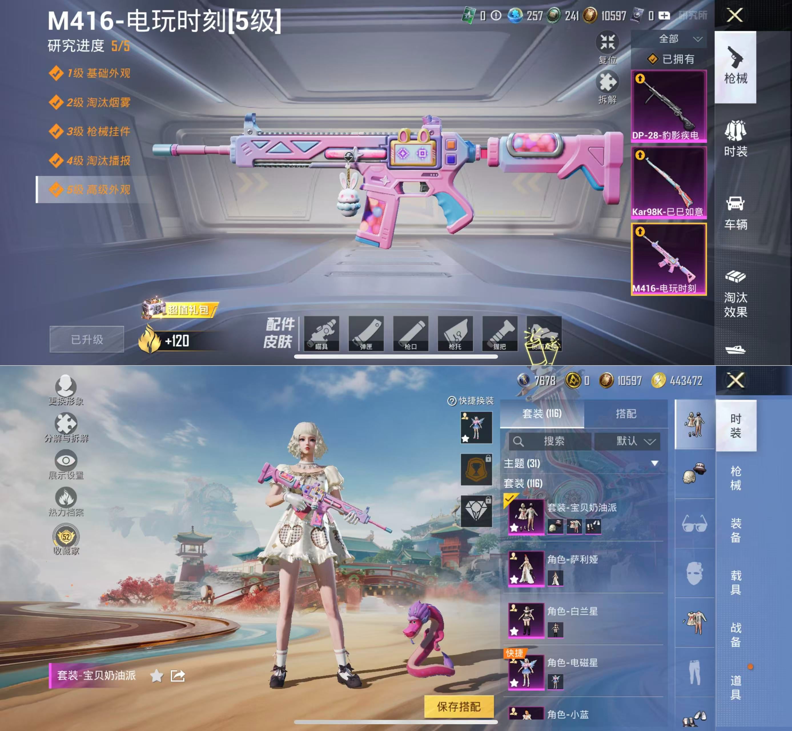 M1047015【女号11粉装-3特效枪 极致幻想 宝贝奶油派 奇异狩猎者,小丑鱼】苹果手Q-11粉装-3特效枪-116套装-151枪皮-7王牌印记-英勇黄金Ⅰ-44321热力值【11粉装】角色-电磁星,极致幻想,角色-白兰星,纯珍童话,宝贝奶油派,角色-小蓝,金属狂野,垂柳戏鸭,角色-美雪,角色-美琪,角色-萨利娅【3特效枪】DP-28-豹影疾电[5级],M416-电玩时刻[5级],Kar98