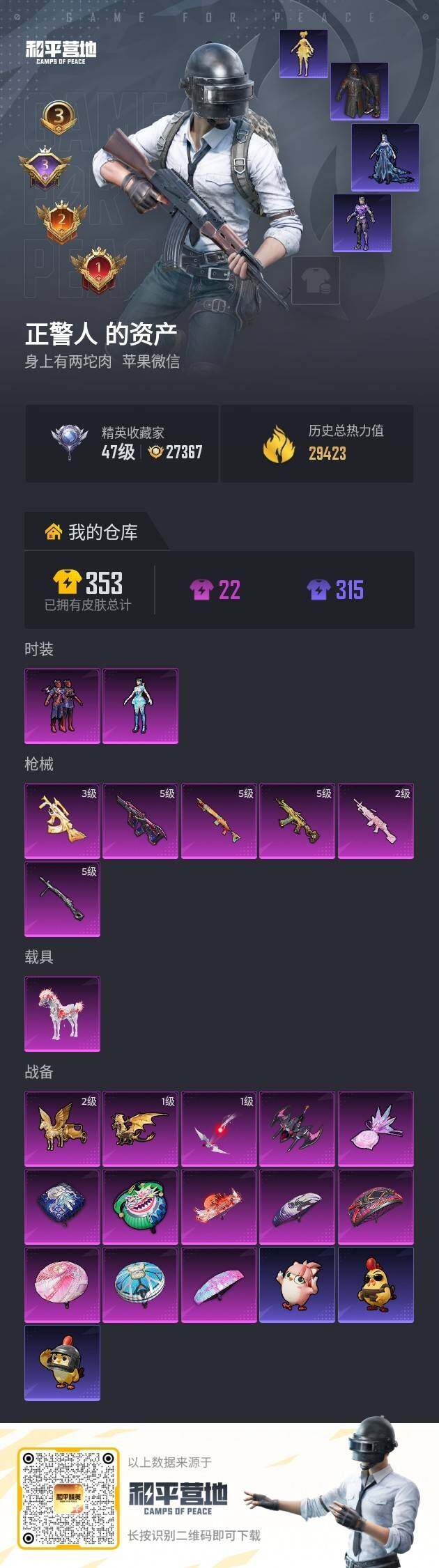 苹果 微信-2粉装-6特效枪-1载具-5粉色飞行器-29423热力值-3王牌印记-57套装-97枪皮