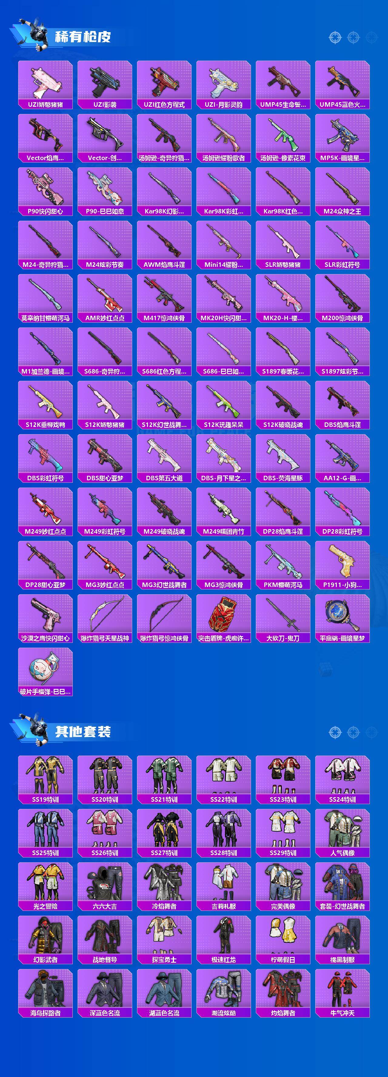 【粉色枪皮等级】:AKM-绿萝繁花(五级),M416-电玩时刻(五级),UMP45-萌骑冒险(三级),Kar98K-巳巳如意(五级),Mk14-福