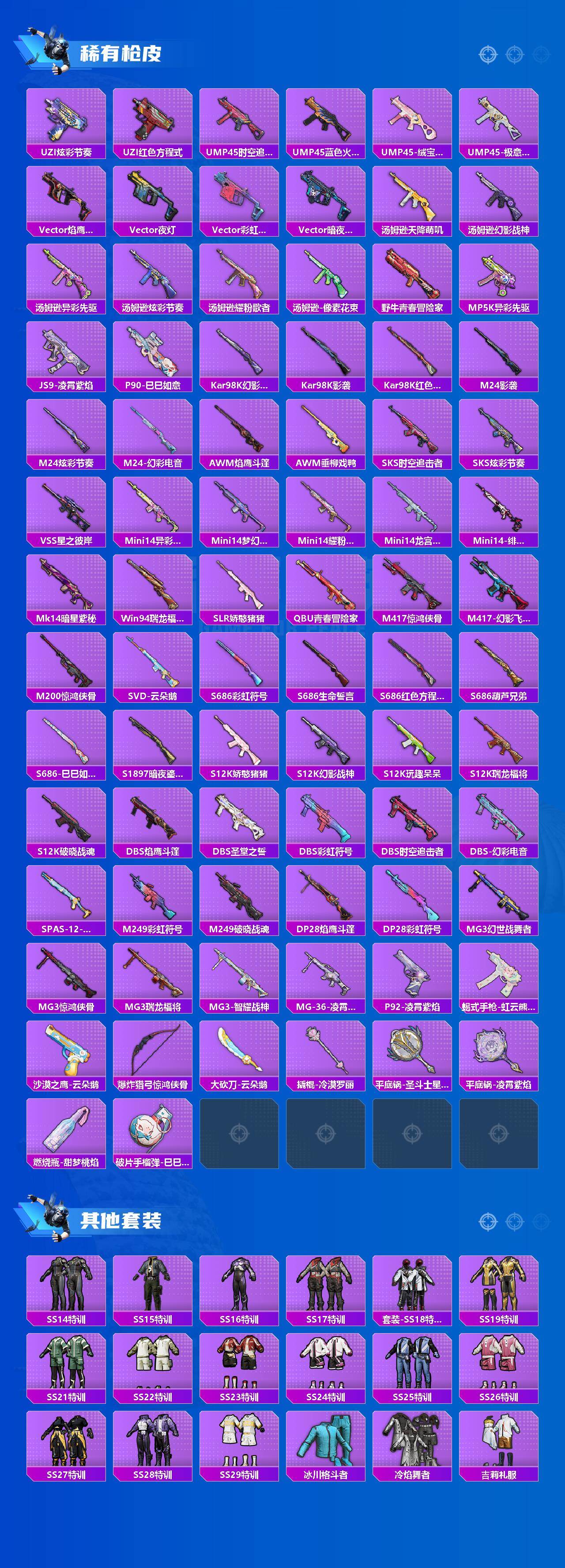 【粉色枪皮等级】:M416-五爪金龙(七级),GROZA-镜光银凌(五级),AUG-暖羊咩咩(五级),ACE32-萌骑漫游(四级),Kar98K-巳巳如意(五级),Mk14-甜梦熊击