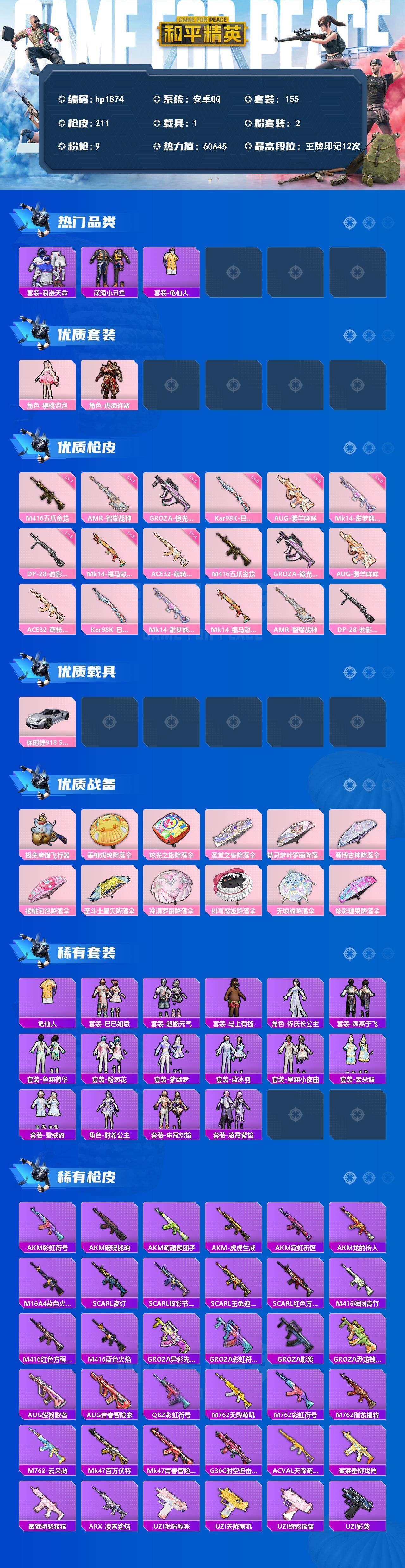 安卓 手Q-2粉装-9特效枪-1载具-1粉色飞行器-60645热力值-12王牌印记-155套装-211枪皮