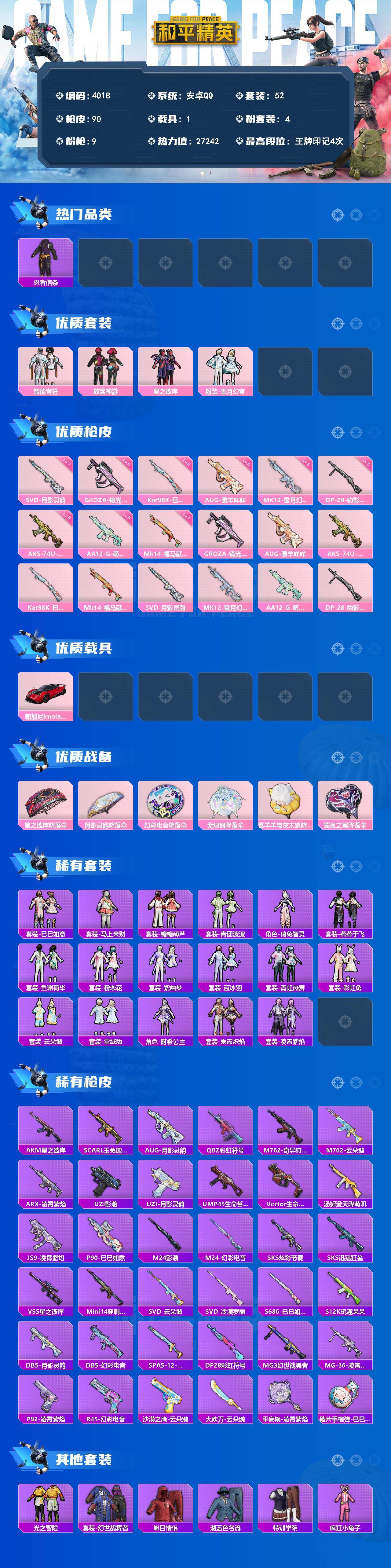 安卓 手Q-4粉装-9特效枪-1载具-0粉色飞行器-27242热力值-4王牌印记-52套装-90枪皮