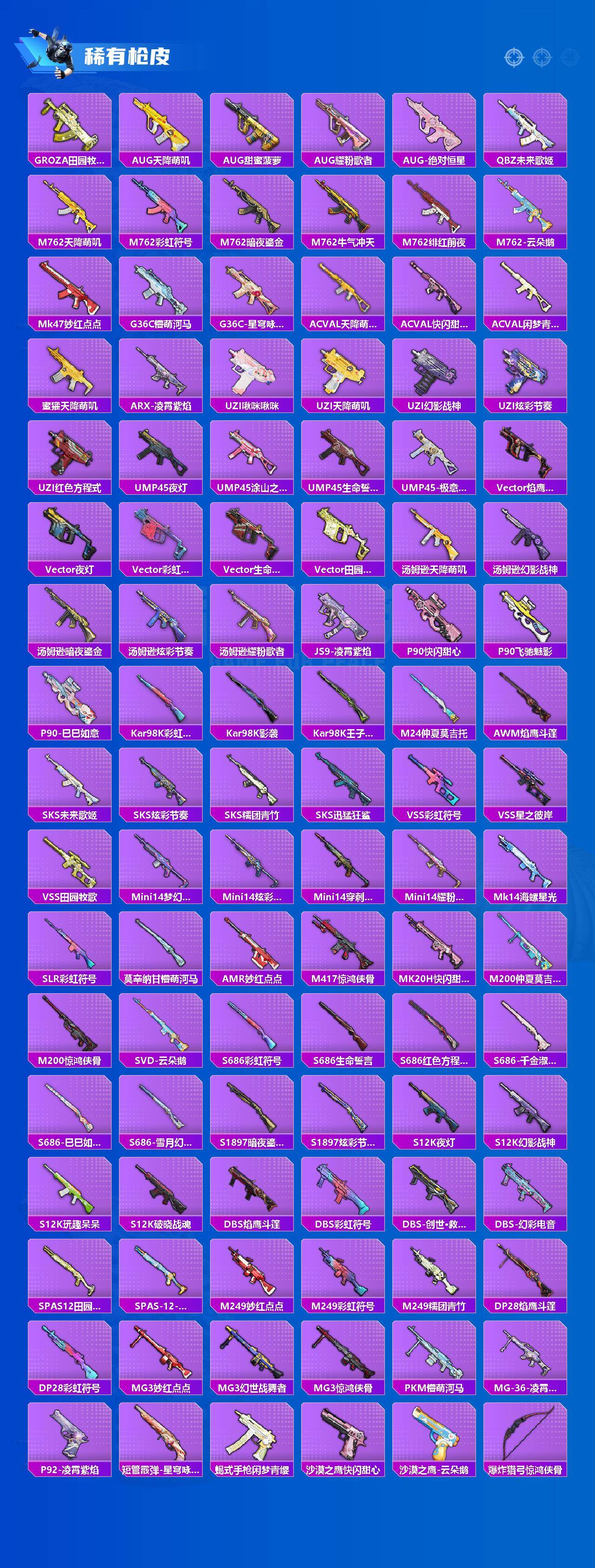 【粉色枪皮等级】:AKM-炫紫旋律(七级),SCAR-L-锦绣绵绵(五级),M416-风花雪月(七级),M416-电玩时刻(五级),ACE3