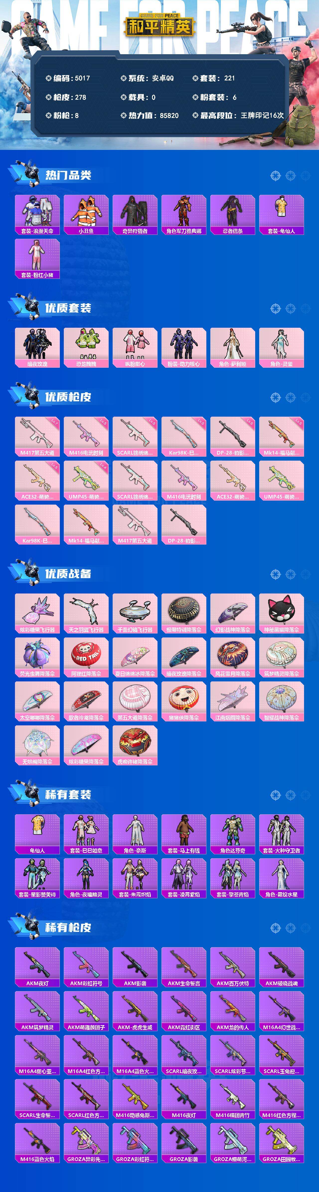 连体王者 满级地铁 奇异 狩猎者安卓 手Q-6粉装-8特效枪-0载具-5粉色飞行器-85820热力值-16王牌印记-221套装-278枪皮
