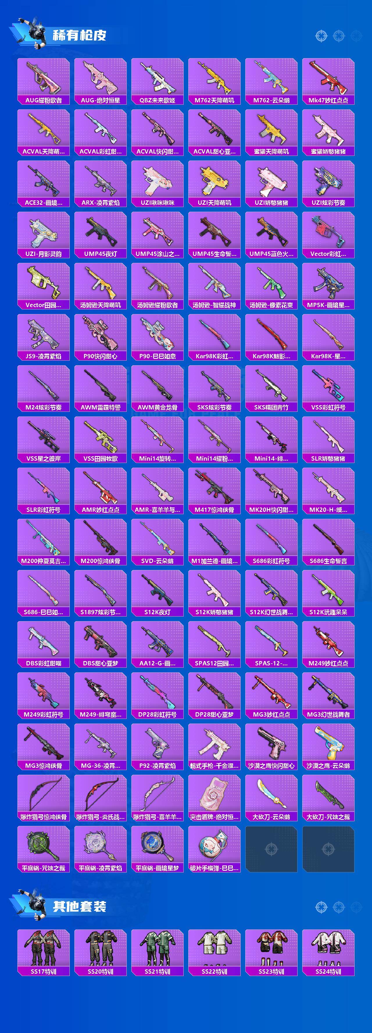 【粉色枪皮等级】:AKM-星际浪客(七级),SCAR-L-锦绣绵绵(五级),M416-五爪金龙(七级),GROZA-镜光银凌(五级),ACE32-
